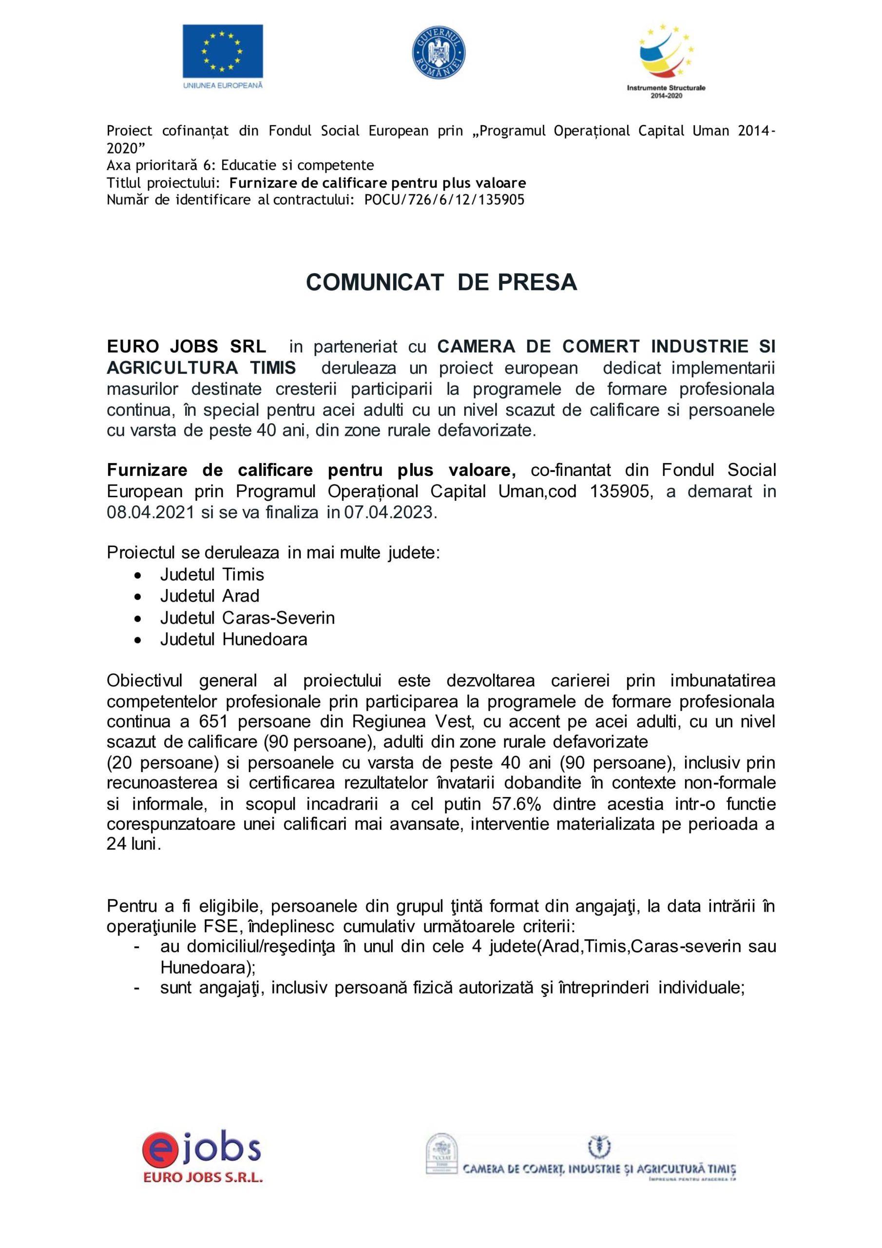 Furnizare de calificare pentru plus valoare, co-finantat din Fondul Social European prin Programul Operațional Capital Uman,cod 135905, a demarat in 08.04.2021 si se va finaliza in 07.04.2023.