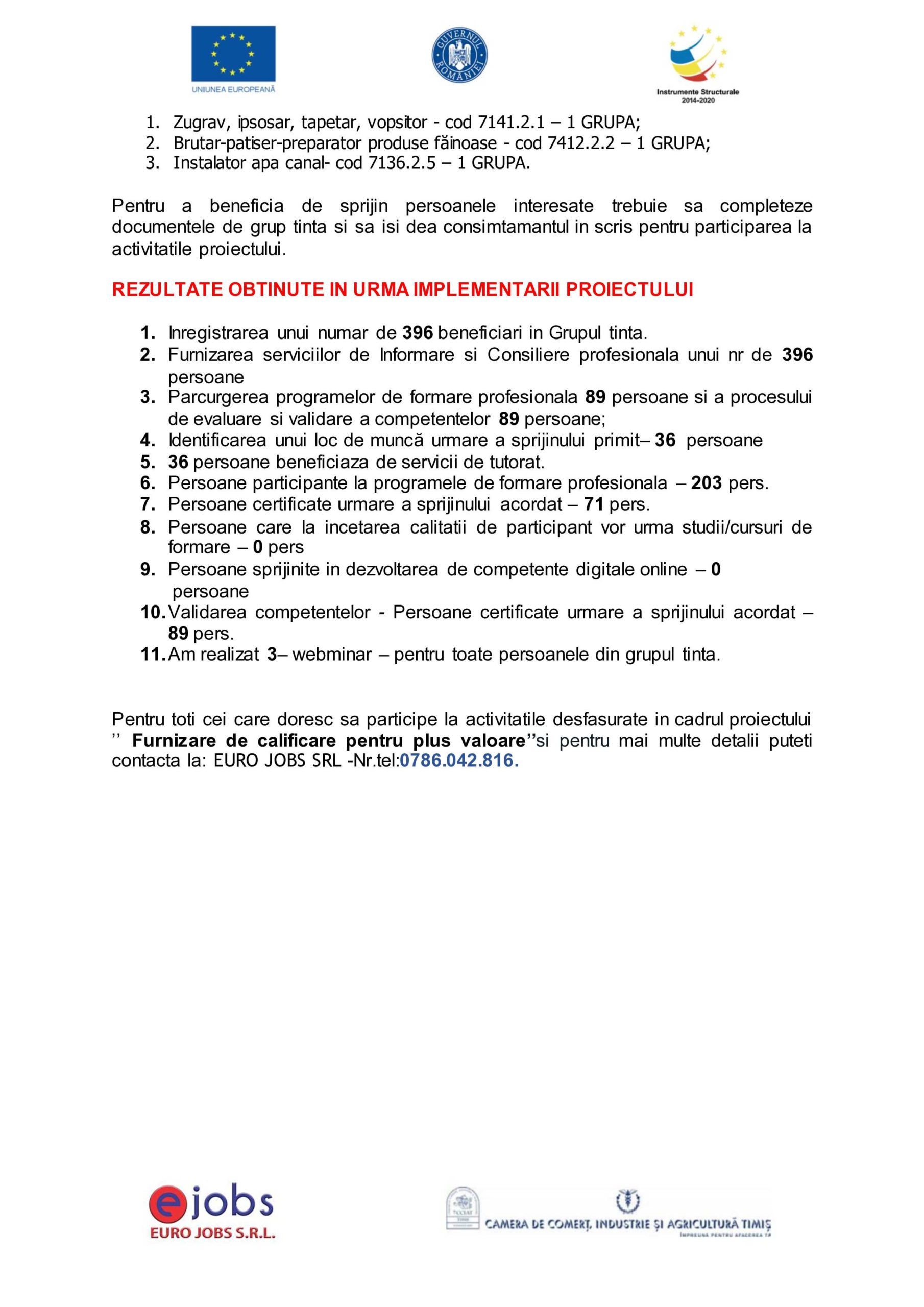 Pentru toti cei care doresc sa participe la activitatile desfasurate in cadrul proiectului ’’ Furnizare de calificare pentru plus valoare’’si pentru mai multe detalii puteti contacta la: EURO JOBS SRL -Nr.tel:0786.042.816.