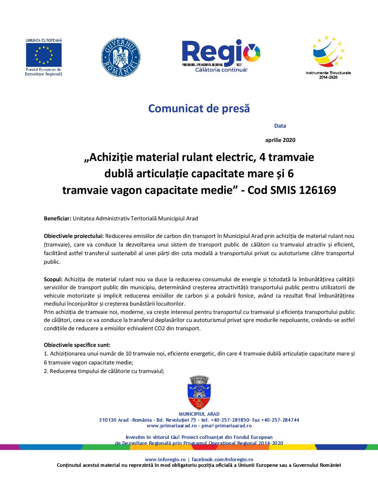 1. Achiziționarea unui număr de 10 tramvaie noi, eficiente energetic, din care 4 tramvaie dublă articulație capacitate mare și 6 tramvaie vagon capacitate medie;