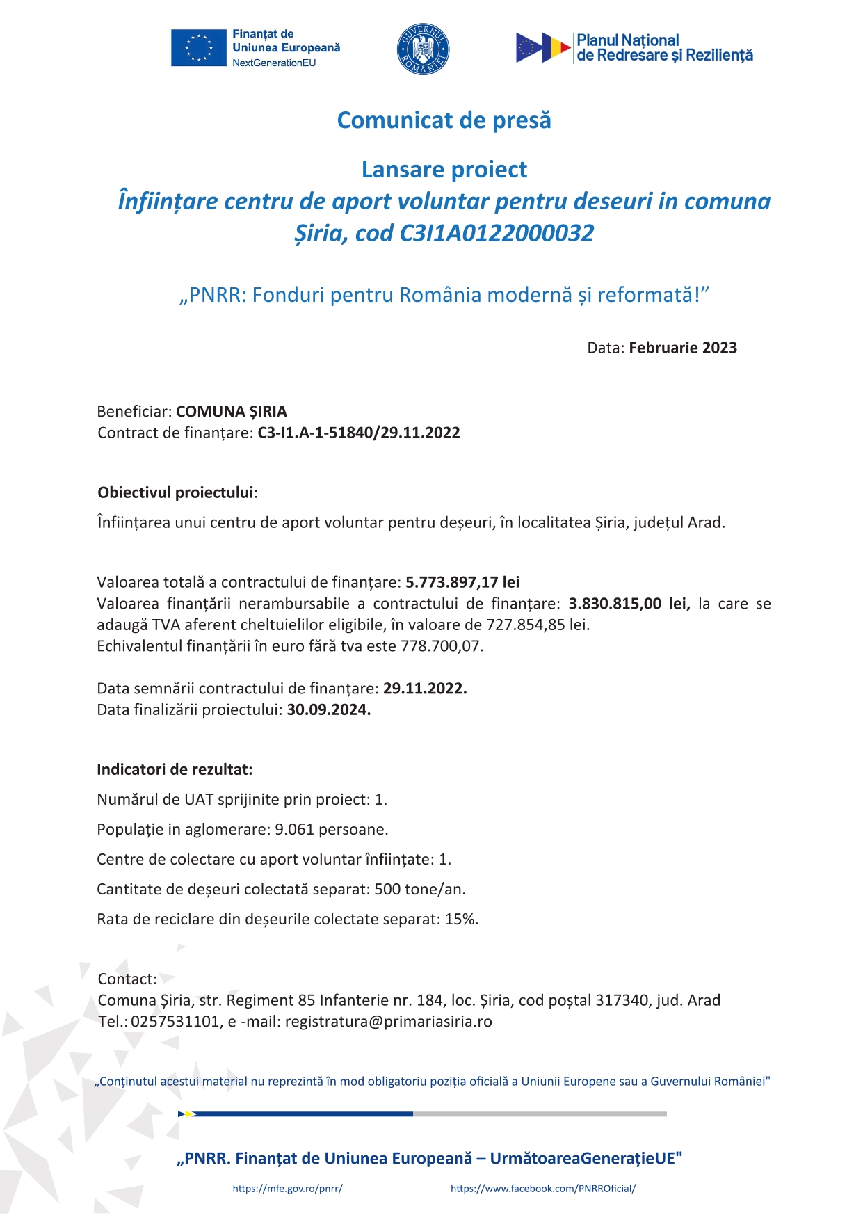 Înființarea unui centru de aport voluntar pentru deșeuri, în localitatea Șiria, județul Arad.