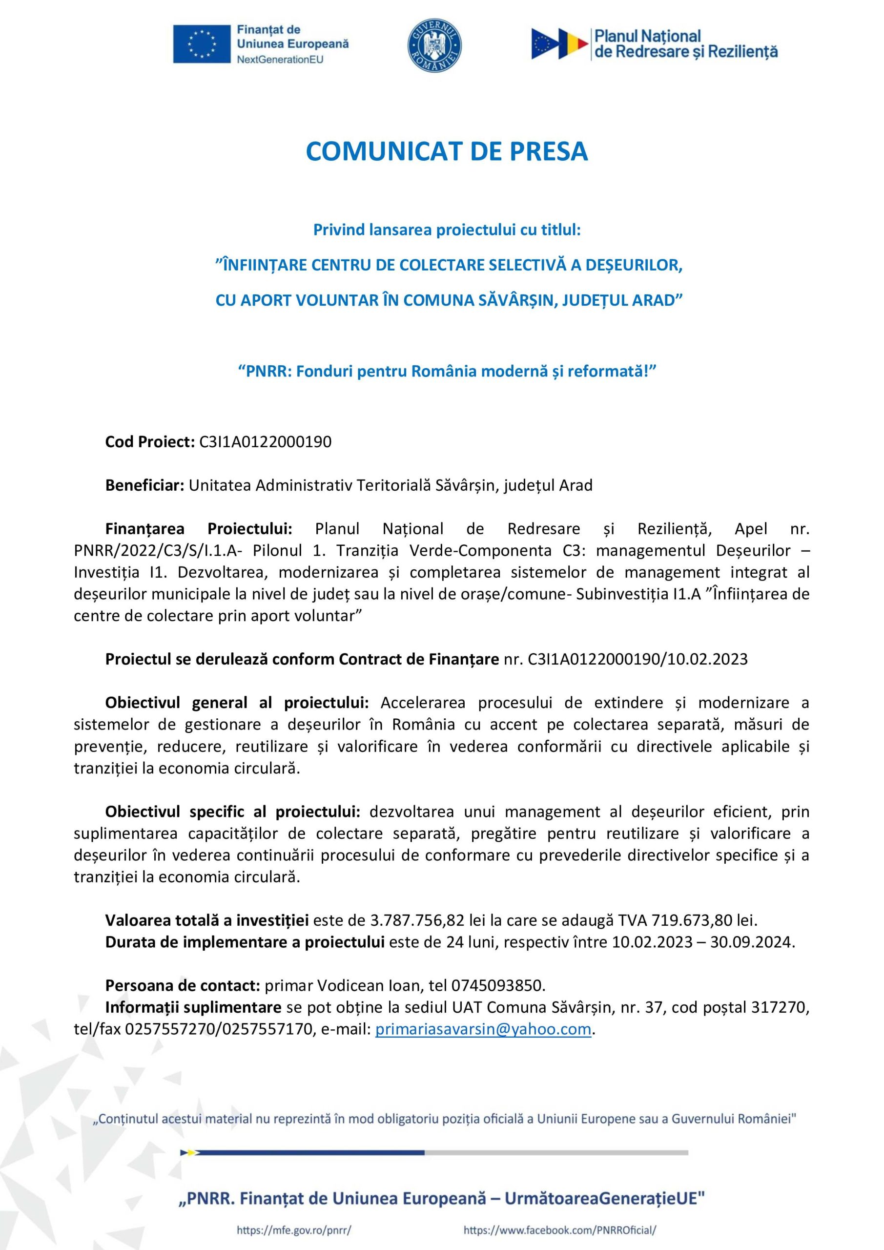 Finanțarea Proiectului: Planul Național de Redresare și Reziliență, Apel nr. PNRR/2022/C3/S/I.1.A- Pilonul 1. Tranziția Verde-Componenta C3: managementul Deșeurilor – Investiția I1. Dezvoltarea, modernizarea și completarea sistemelor de management integrat al deșeurilor municipale la nivel de județ sau la nivel de orașe/comune- Subinvestiția I1.A ”Înființarea de centre de colectare prin aport voluntar”