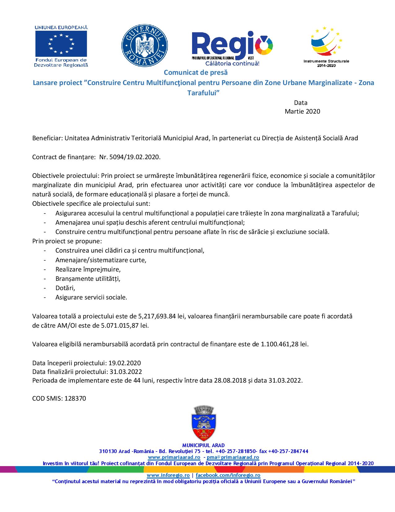 Beneficiar: Unitatea Administrativ Teritorială Municipiul Arad, în parteneriat cu Direcția de Asistență Socială Arad