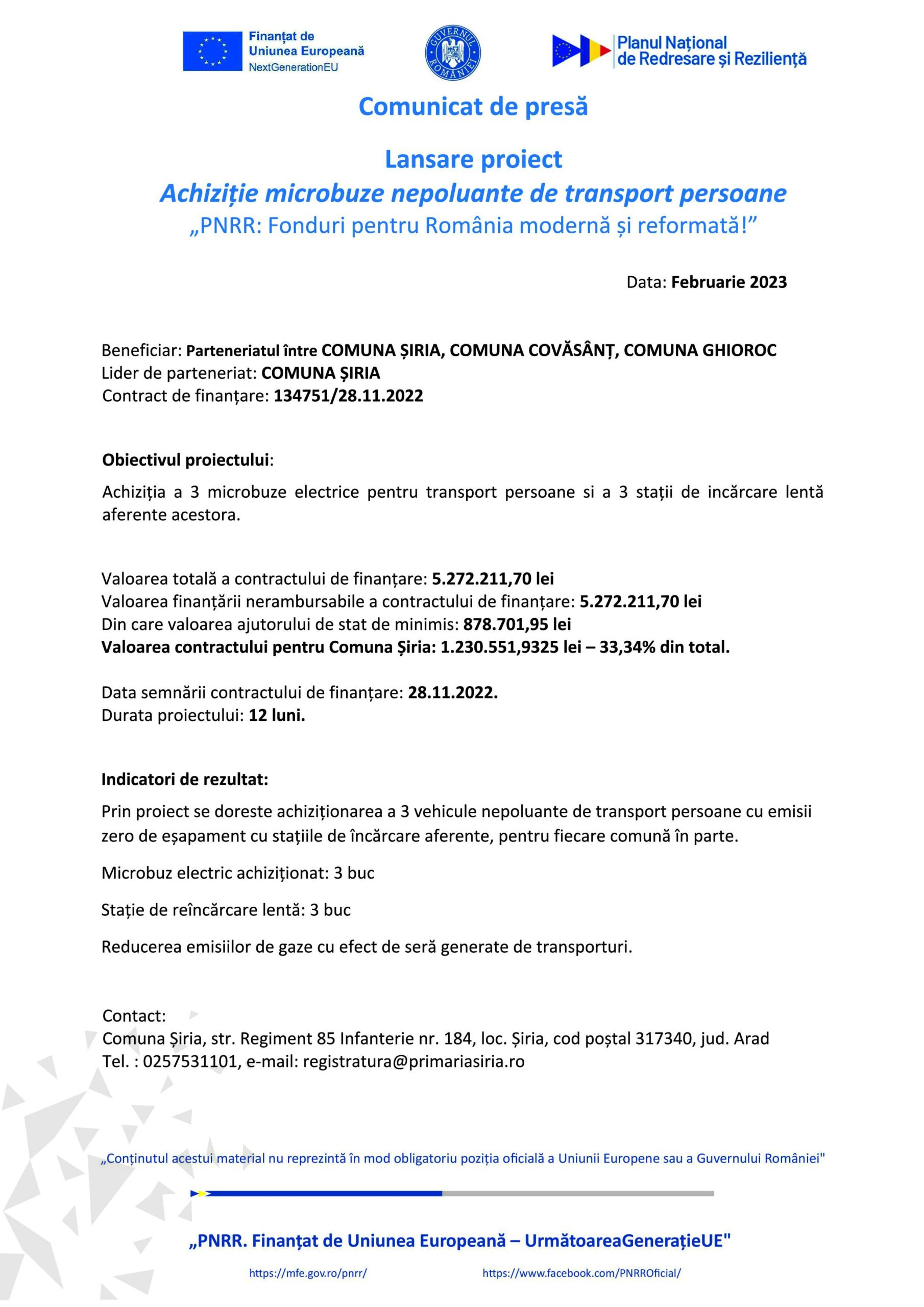 Beneficiar: Parteneriatul între COMUNA ȘIRIA, COMUNA COVĂSÂNȚ, COMUNA GHIOROC