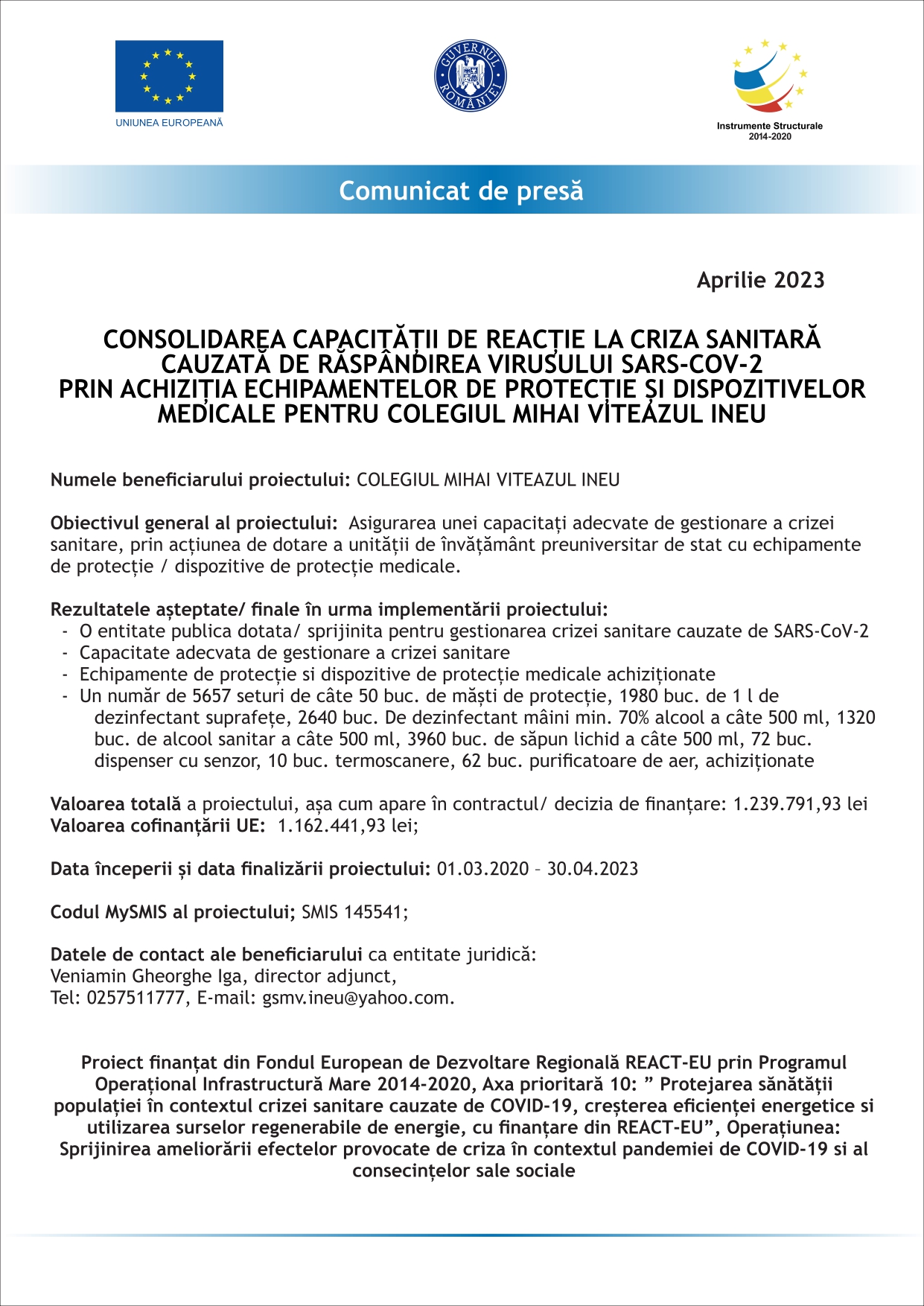Data începerii și data finalizării proiectului: 01.03.2020 – 30.04.2023