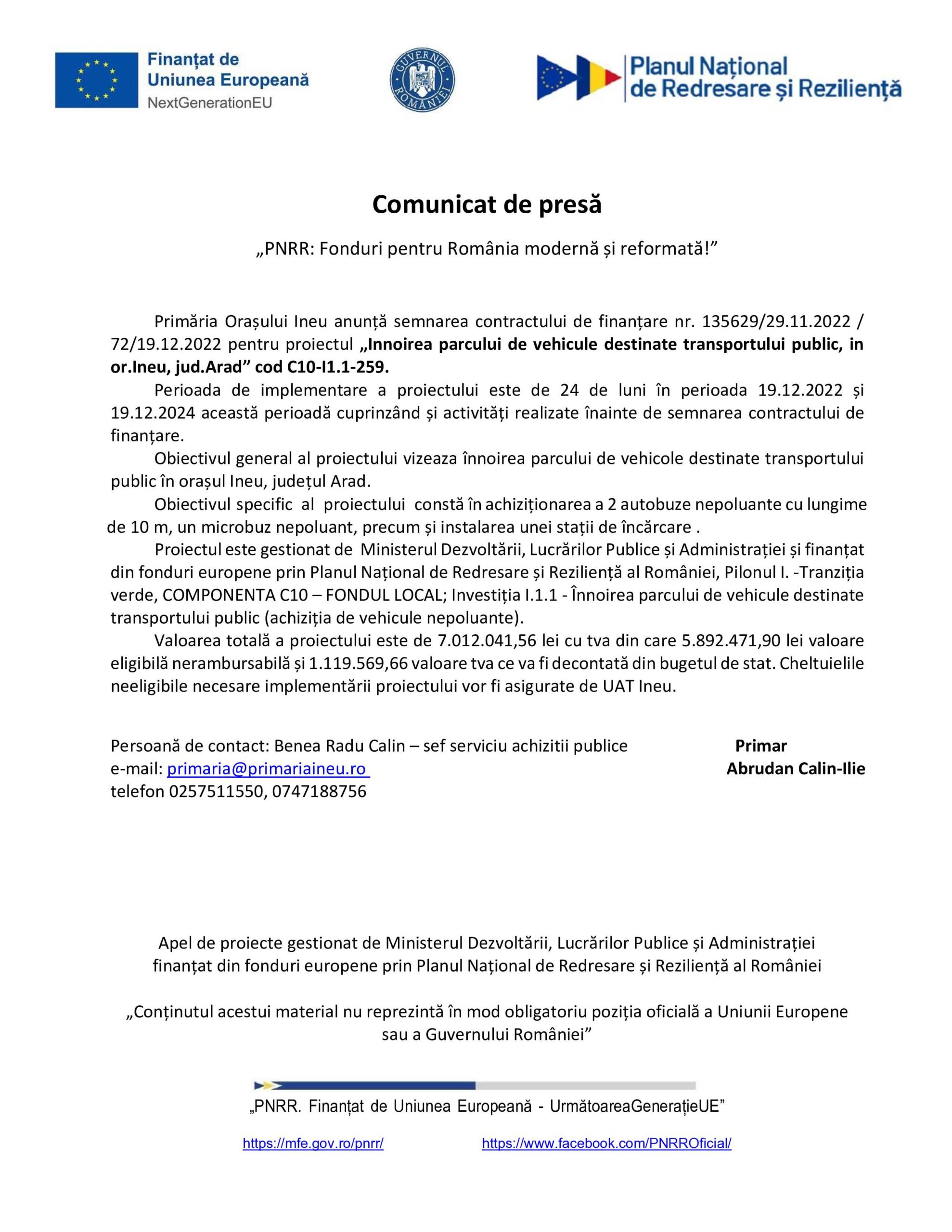 Primăria Orașului Ineu anunță semnarea contractului de finanțare nr. 135629/29.11.2022 / 72/19.12.2022 pentru proiectul „Innoirea parcului de vehicule destinate transportului public, in or.Ineu, jud.Arad” cod C10-I1.1-259.
