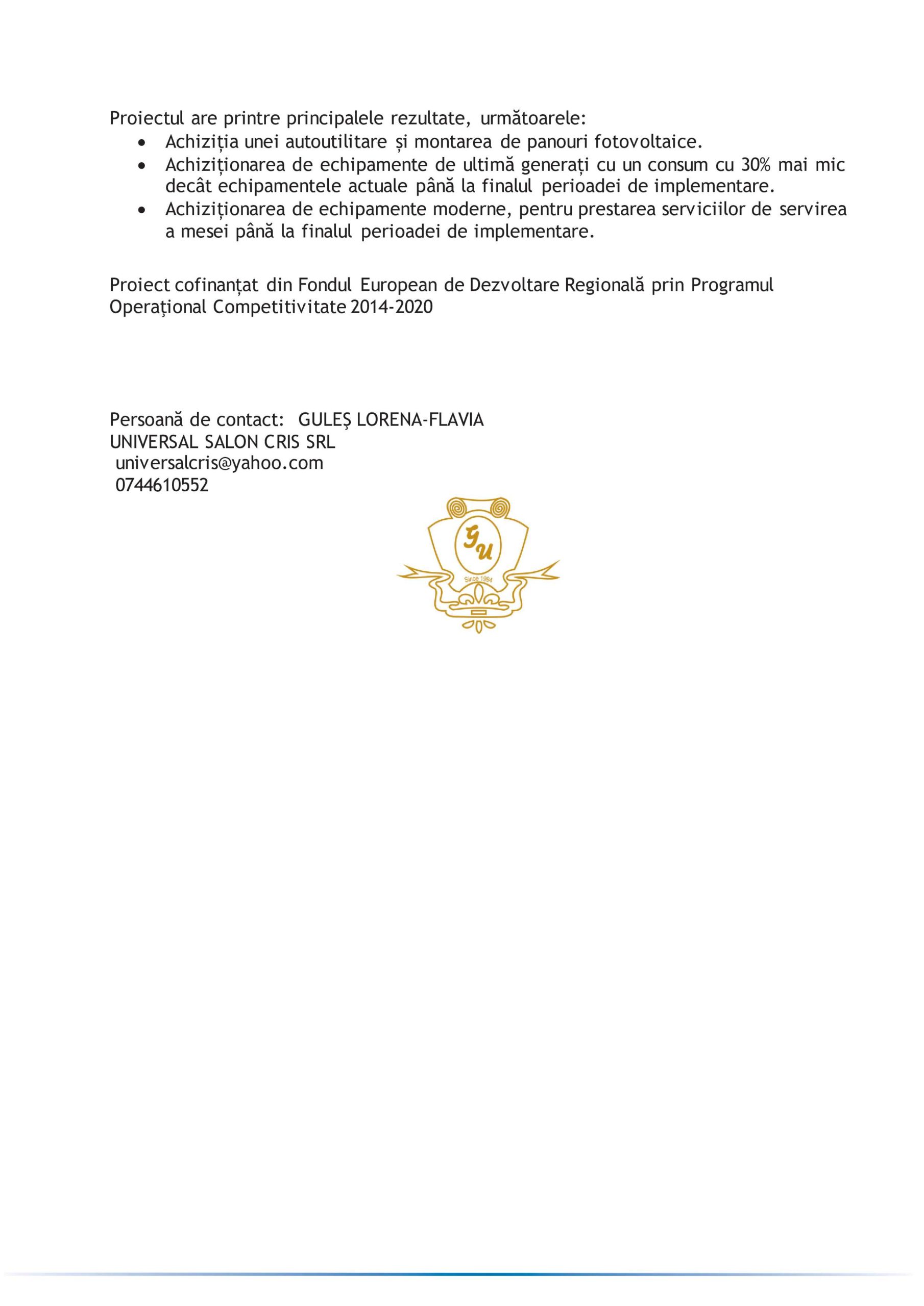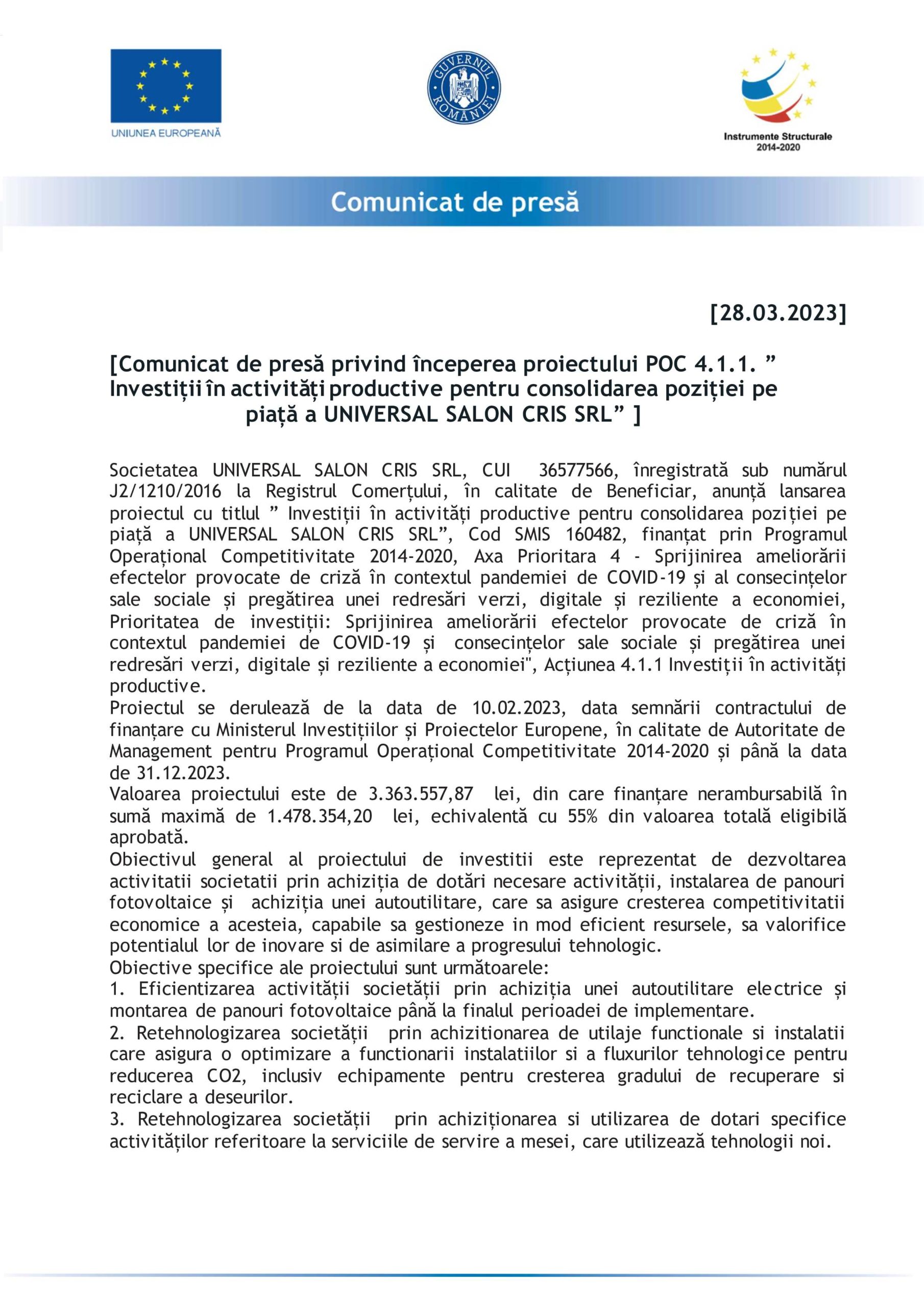 Societatea UNIVERSAL SALON CRIS SRL, CUI 36577566, înregistrată sub numărul J2/1210/2016 la Registrul Comerțului, în calitate de Beneficiar, anunță lansarea proiectul cu titlul ” Investiții în activități productive pentru consolidarea poziției pe piață a UNIVERSAL SALON CRIS SRL”, Cod SMIS 160482, finanțat prin Programul Operațional Competitivitate 2014-2020, Axa Prioritara 4 – Sprijinirea ameliorării efectelor provocate de criză în contextul pandemiei de COVID-19 și al consecințelor sale sociale și pregătirea unei redresări verzi, digitale și reziliente a economiei, Prioritatea de investiții: Sprijinirea ameliorării efectelor provocate de criză în contextul pandemiei de COVID-19 și consecințelor sale sociale și pregătirea unei redresări verzi, digitale și reziliente a economiei”, Acțiunea 4.1.1 Investiții în activități productive.