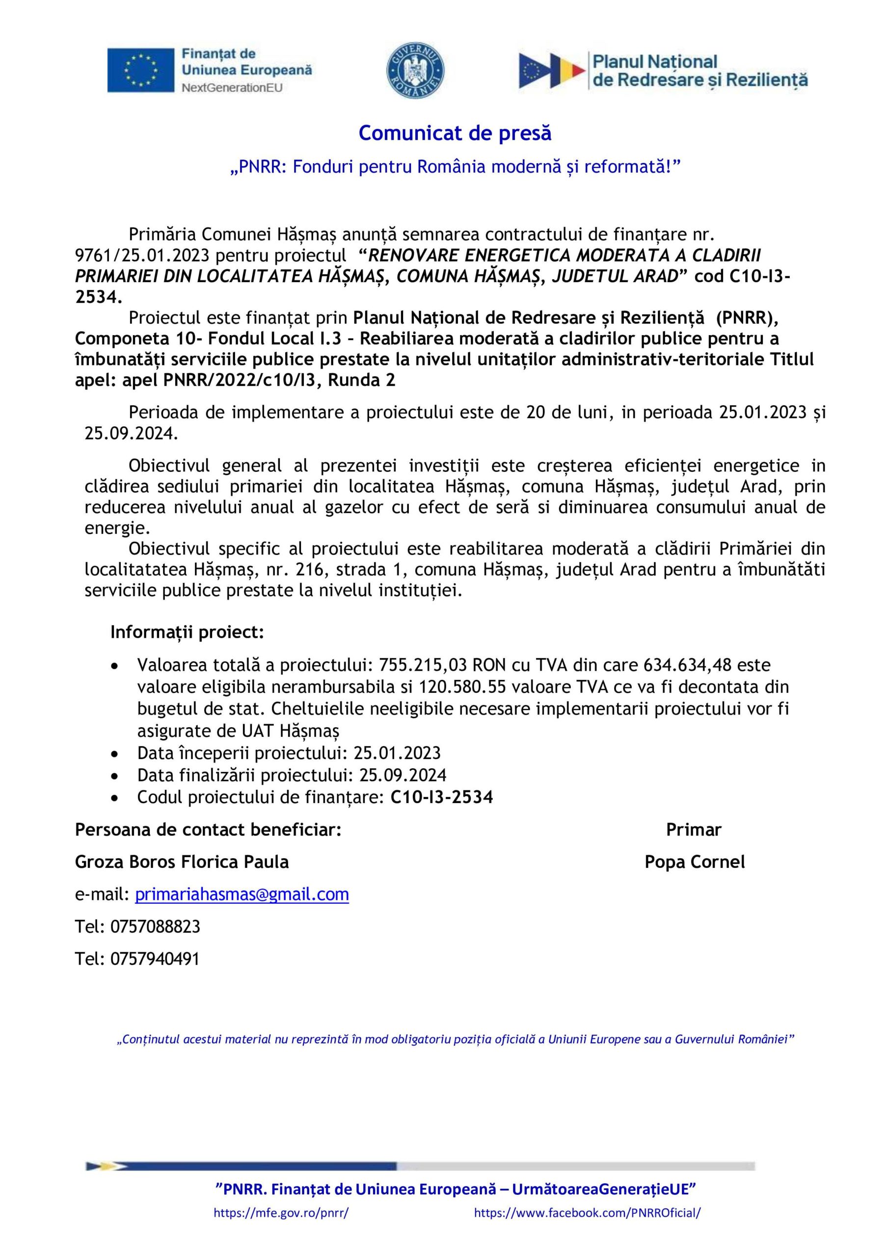 Primăria Comunei Hășmaș anunță semnarea contractului de finanțare nr. 9761/25.01.2023 pentru proiectul “RENOVARE ENERGETICA MODERATA A CLADIRII PRIMARIEI DIN LOCALITATEA HĂȘMAȘ, COMUNA HĂȘMAȘ, JUDETUL ARAD” cod C10-I3-2534.