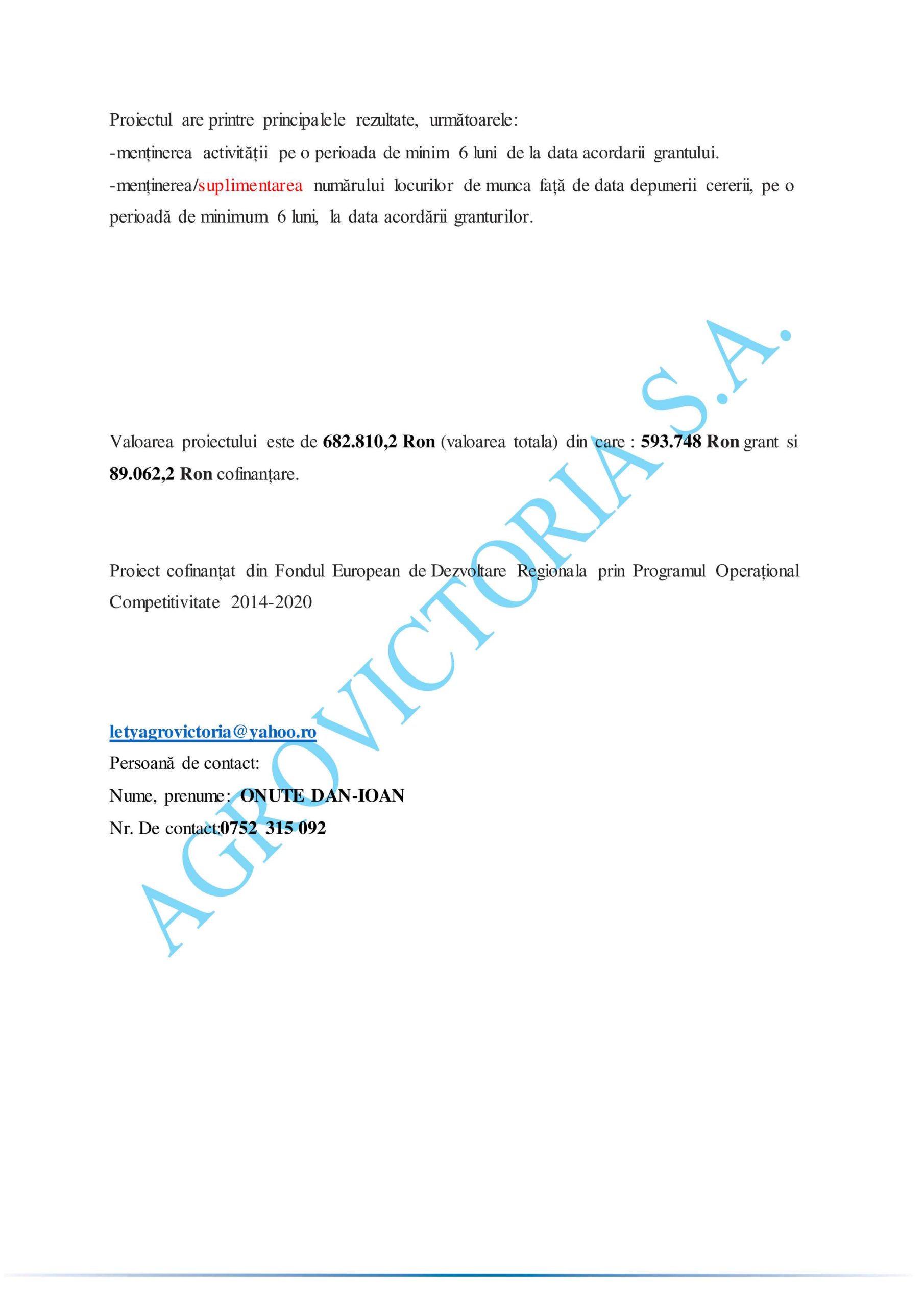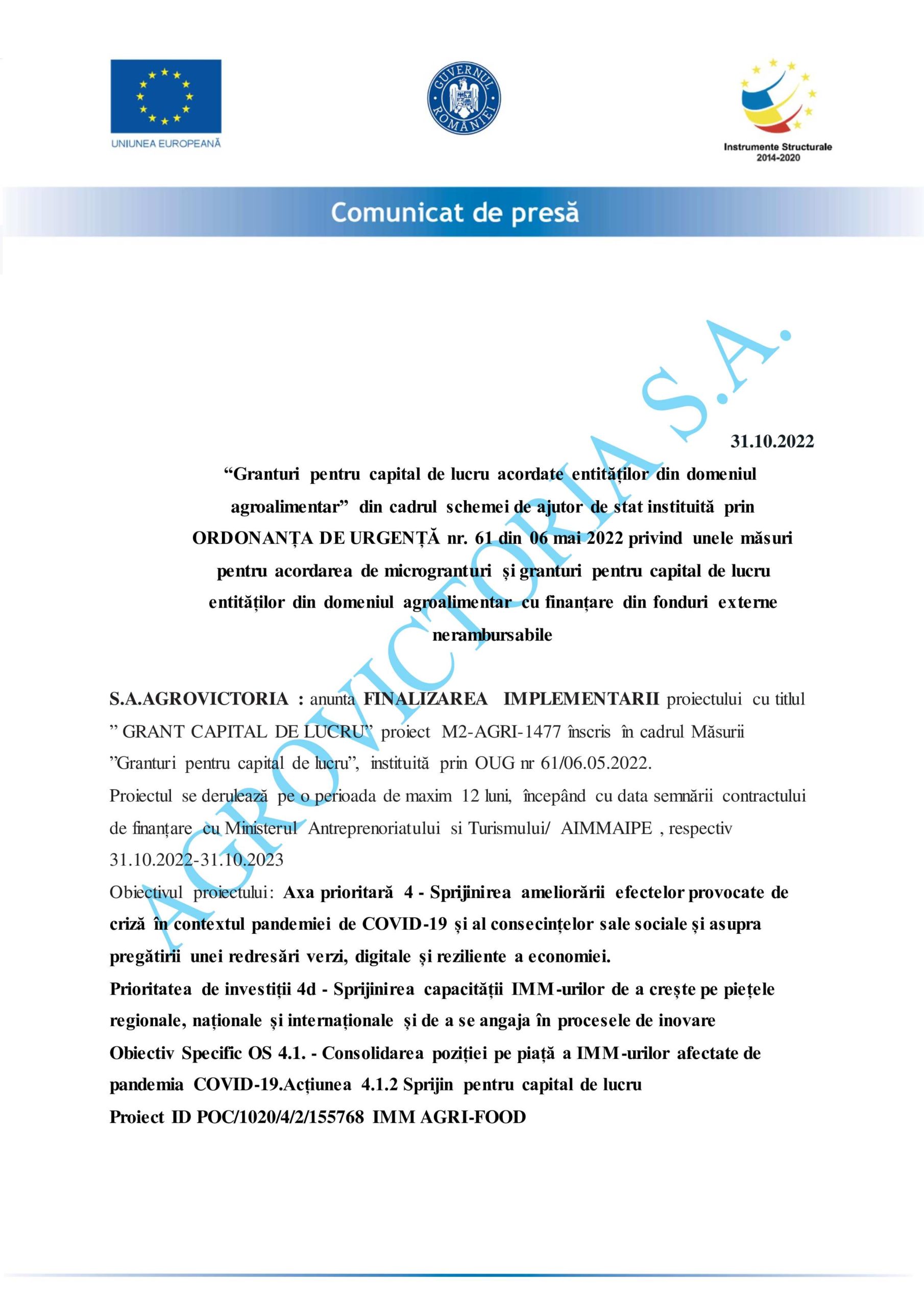 S.A.AGROVICTORIA : anunta FINALIZAREA IMPLEMENTARII proiectului cu titlul ” GRANT CAPITAL DE LUCRU” proiect M2-AGRI-1477 înscris în cadrul Măsurii ”Granturi pentru capital de lucru”, instituită prin OUG nr 61/06.05.2022.