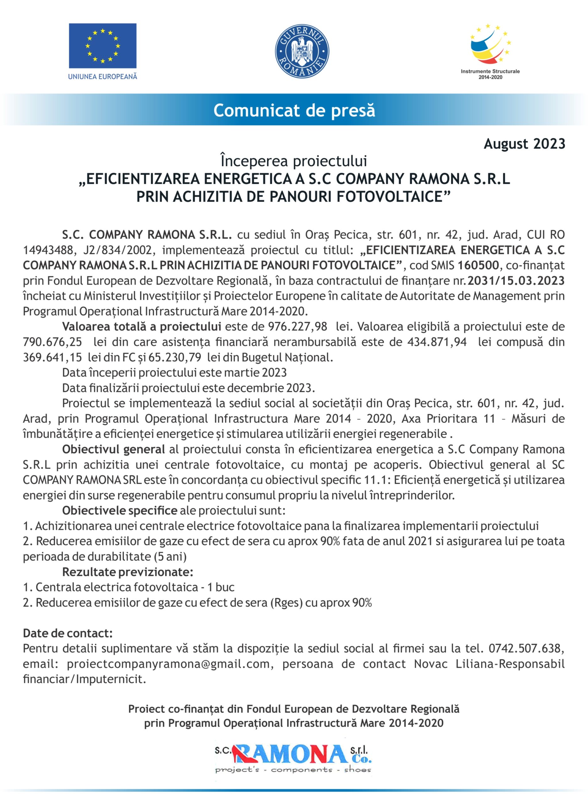 S.C. COMPANY RAMONA S.R.L. cu sediul în Oraş Pecica, str. 601, nr. 42, jud. Arad, CUI RO 14943488, J2/834/2002, implementează proiectul cu titlul: „EFICIENTIZAREA ENERGETICA A S.C COMPANY RAMONA S.R.L PRIN ACHIZITIA DE PANOURI FOTOVOLTAICE”, cod SMIS 160500, co-finanţat prin Fondul European de Dezvoltare Regională, în baza contractului de finanţare nr.2031/15.03.2023 încheiat cu Ministerul Investițiilor și Proiectelor Europene în calitate de Autoritate de Management prin Programul Operațional Infrastructură Mare 2014-2020.