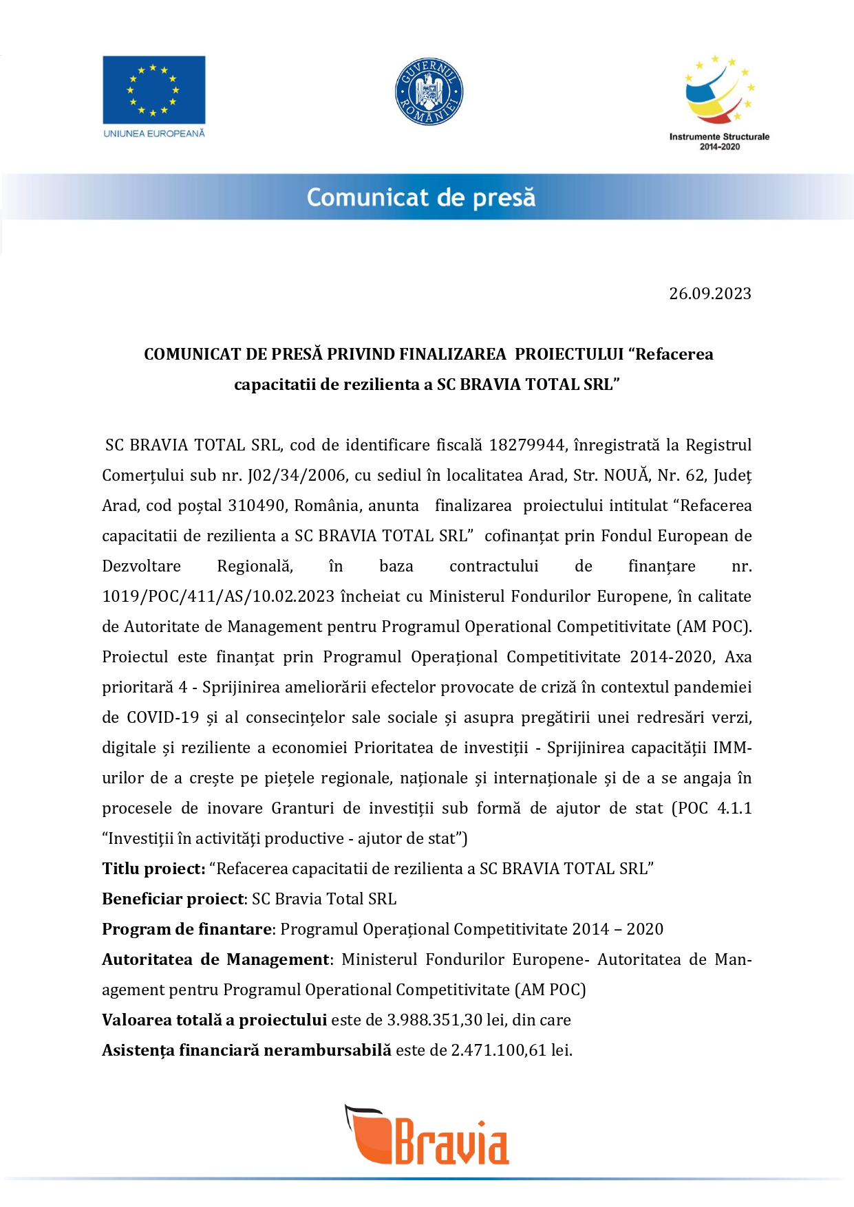 SC BRAVIA TOTAL SRL, cod de identificare fiscală 18279944, înregistrată la Registrul Comerțului sub nr. J02/34/2006, cu sediul în localitatea Arad, Str. NOUĂ, Nr. 62, Județ Arad, cod poștal 310490, România, anunta finalizarea proiectului intitulat “Refacerea capacitatii de rezilienta a SC BRAVIA TOTAL SRL” cofinanțat prin Fondul European de Dezvoltare Regională, în baza contractului de finanțare nr. 1019/POC/411/AS/10.02.2023 încheiat cu Ministerul Fondurilor Europene, în calitate de Autoritate de Management pentru Programul Operational Competitivitate (AM POC). Proiectul este finanțat prin Programul Operațional Competitivitate 2014-2020, Axa prioritară 4 – Sprijinirea ameliorării efectelor provocate de criză în contextul pandemiei de COVID-19 și al consecințelor sale sociale și asupra pregătirii unei redresări verzi, digitale și reziliente a economiei Prioritatea de investiții – Sprijinirea capacității IMM-urilor de a crește pe piețele regionale, naționale și internaționale și de a se angaja în procesele de inovare Granturi de investiții sub formă de ajutor de stat (POC 4.1.1 “Investiţii în activităţi productive – ajutor de stat”)