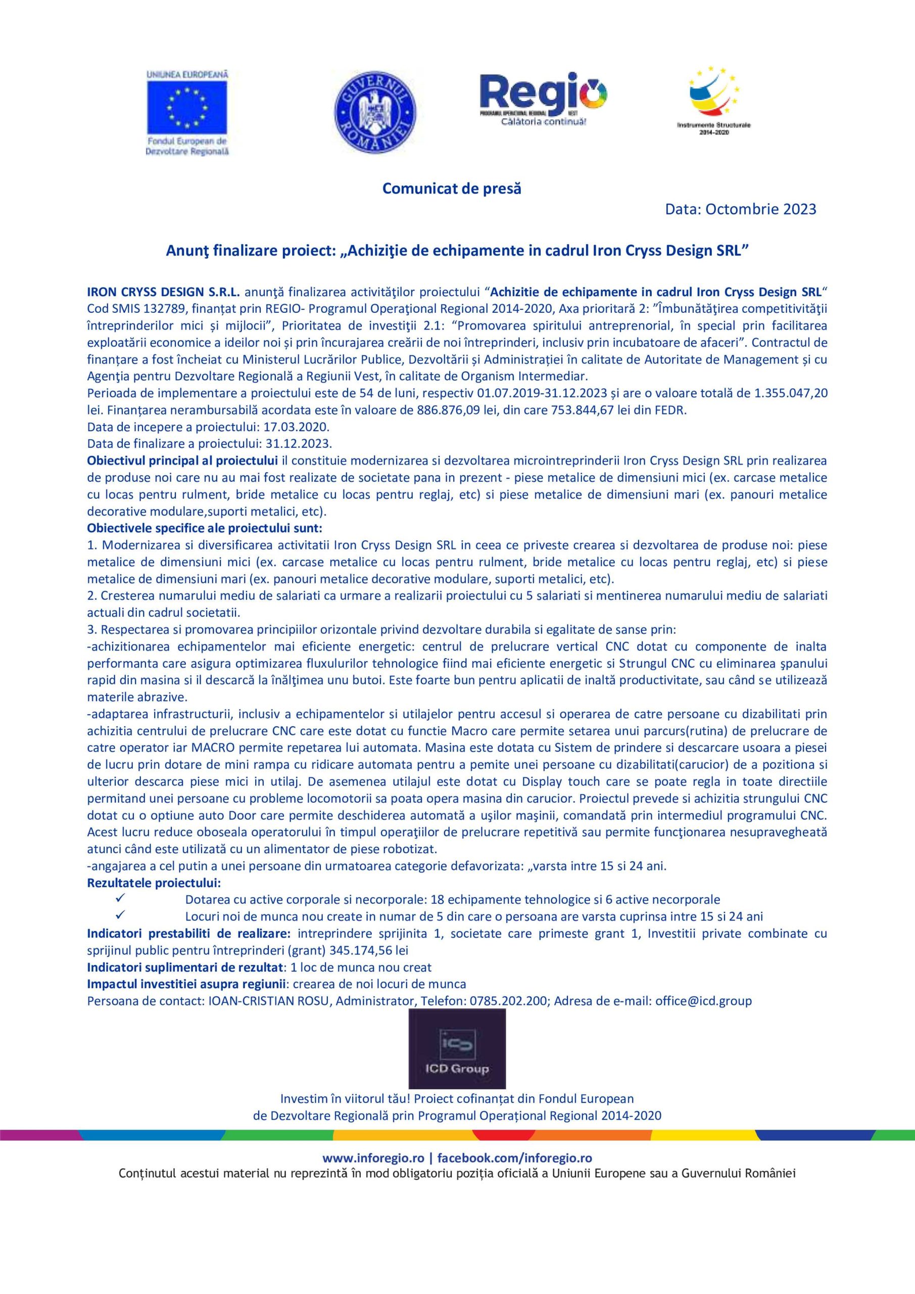 IRON CRYSS DESIGN S.R.L. anunţă finalizarea activităţilor proiectului “Achizitie de echipamente in cadrul Iron Cryss Design SRL“ Cod SMIS 132789, finanțat prin REGIO- Programul Operaţional Regional 2014-2020, Axa prioritară 2: ”Îmbunătăţirea competitivităţii întreprinderilor mici și mijlocii”, Prioritatea de investiţii 2.1: “Promovarea spiritului antreprenorial, în special prin facilitarea exploatării economice a ideilor noi și prin încurajarea creării de noi întreprinderi, inclusiv prin incubatoare de afaceri”. Contractul de finanțare a fost încheiat cu Ministerul Lucrărilor Publice, Dezvoltării și Administrației în calitate de Autoritate de Management și cu Agenţia pentru Dezvoltare Regională a Regiunii Vest, în calitate de Organism Intermediar.