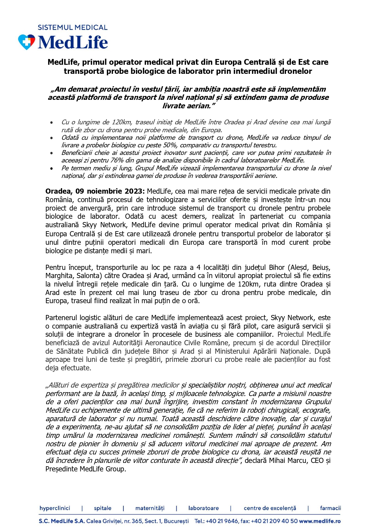 „Alături de expertiza și pregătirea medicilor și specialiștilor noștri, obținerea unui act medical performant are la bază, în același timp, și mijloacele tehnologice. Ca parte a misiunii noastre de a oferi pacienților cea mai bună îngrijire, investim constant în modernizarea Grupului MedLife cu echipemente de ultimă generație, fie că ne referim la roboți chirugicali, ecografe, aparatură de laborator și nu numai. Toată această deschidere către inovație, dar și curajul de a experimenta, ne-au ajutat să ne consolidăm poziția de lider al pieței, punând în același timp umărul la modernizarea medicinei românești. Suntem mândri să consolidăm statutul nostru de pionier în domeniu și să aducem viitorul medicinei mai aproape de prezent. Am efectuat deja cu succes primele zboruri de probe biologice cu drona, iar această reușită ne dă încredere în planurile de viitor conturate în această direcție”, declară Mihai Marcu, CEO și Președinte MedLife Group.
