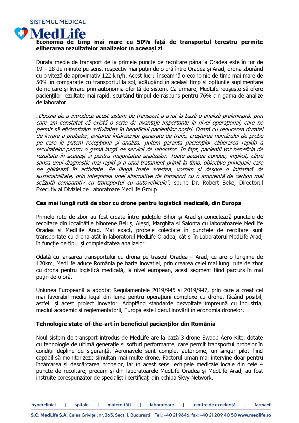„Decizia de a introduce acest sistem de transport a avut la bază o analiză preliminară, prin care am constatat că există o serie de avantaje importante la nivel operațional, care ne permit să eficientizăm activitatea în beneficiul pacienților noștri. Odată cu reducerea duratei de livrare a probelor, evitarea întârzierilor generate de trafic, creșterea numărului de probe pe care le putem recepționa și analiza, putem garanta pacienților eliberarea rapidă a rezultatelor pentru o gamă largă de servicii de laborator. În fapt, pacienții vor beneficia de rezultate în aceeași zi pentru majoritatea analizelor. Toate acestea conduc, implicit, către șansa unui diagnostic mai rapid și a unui tratament primit la timp, obiective principale care ne ghidează în activitate. Pe lângă toate acestea, vorbim și despre o inițiativă de sustenabilitate, prin integrarea unei alternative de transport cu o amprentă de carbon mai scăzută comparativ cu transportul cu autovehicule”, spune Dr. Robert Beke, Directorul Executiv al Diviziei de Laboratoare MedLife Group.