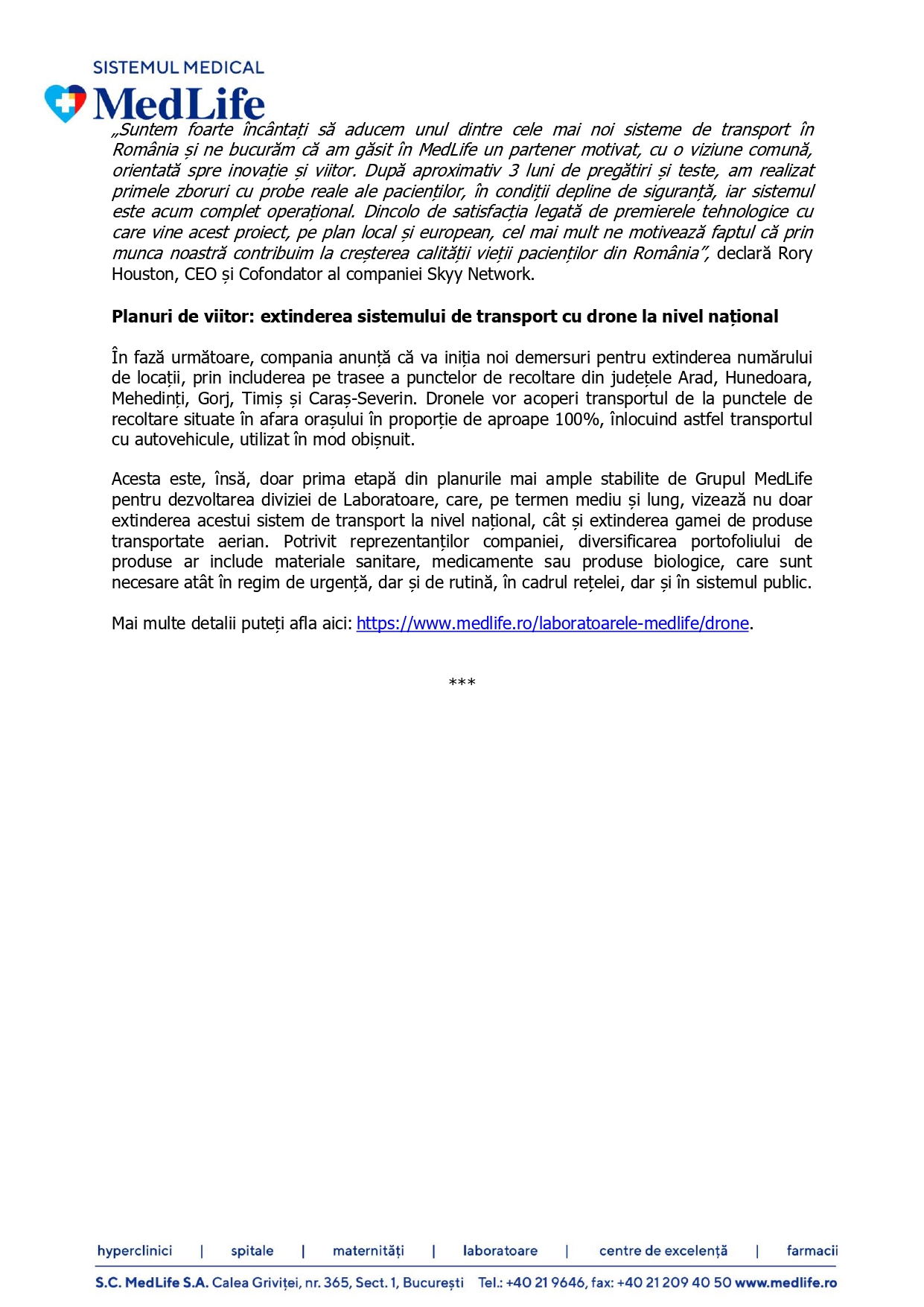 „Suntem foarte încântați să aducem unul dintre cele mai noi sisteme de transport în România și ne bucurăm că am găsit în MedLife un partener motivat, cu o viziune comună, orientată spre inovație și viitor. După aproximativ 3 luni de pregătiri și teste, am realizat primele zboruri cu probe reale ale pacienților, în condiții depline de siguranță, iar sistemul este acum complet operațional. Dincolo de satisfacția legată de premierele tehnologice cu care vine acest proiect, pe plan local și european, cel mai mult ne motivează faptul că prin munca noastră contribuim la creșterea calității vieții pacienților din România”, declară Rory Houston, CEO și Cofondator al companiei Skyy Network.