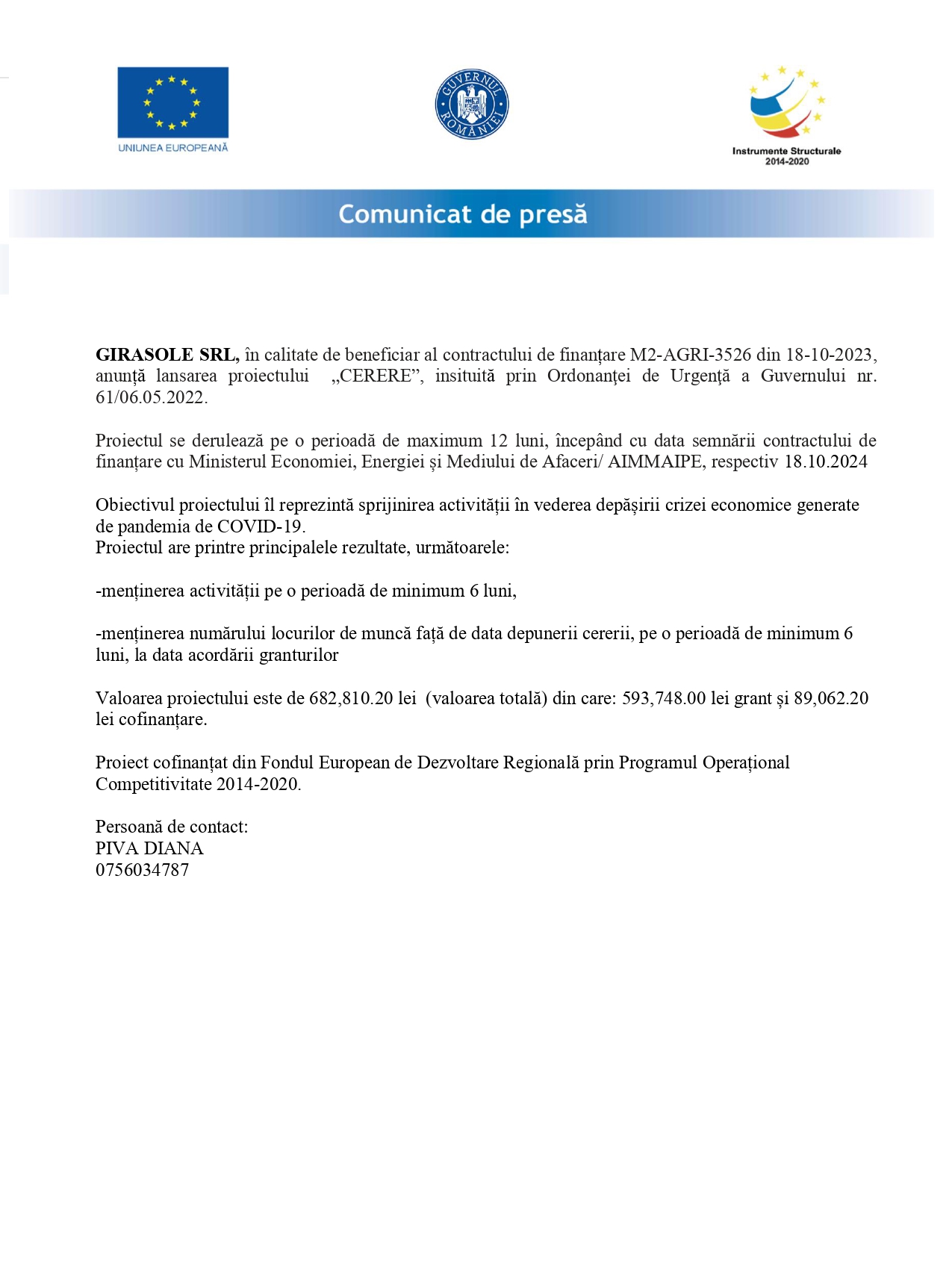 GIRASOLE SRL, în calitate de beneficiar al contractului de finanțare M2-AGRI-3526 din 18-10-2023, anunță lansarea proiectului „CERERE”, insituită prin Ordonanţei de Urgenţă a Guvernului nr. 61/06.05.2022.