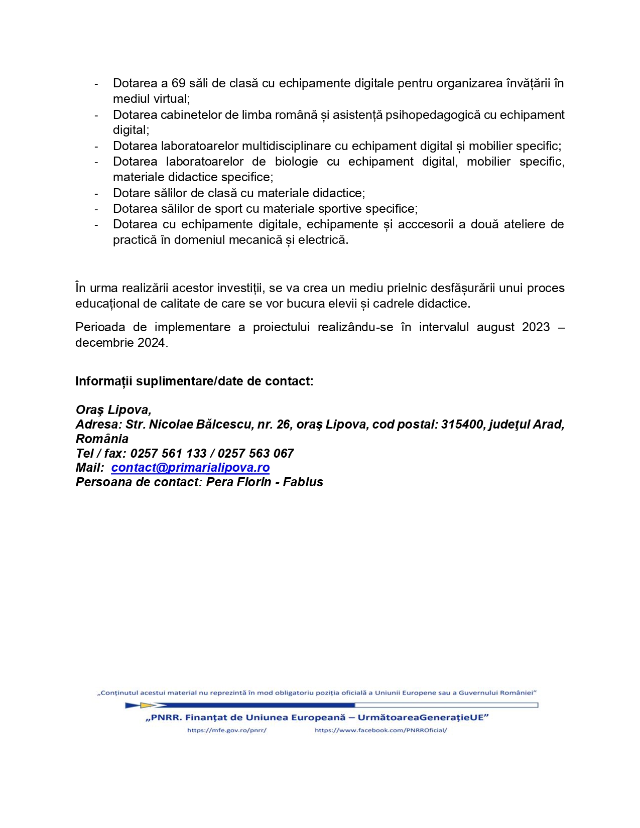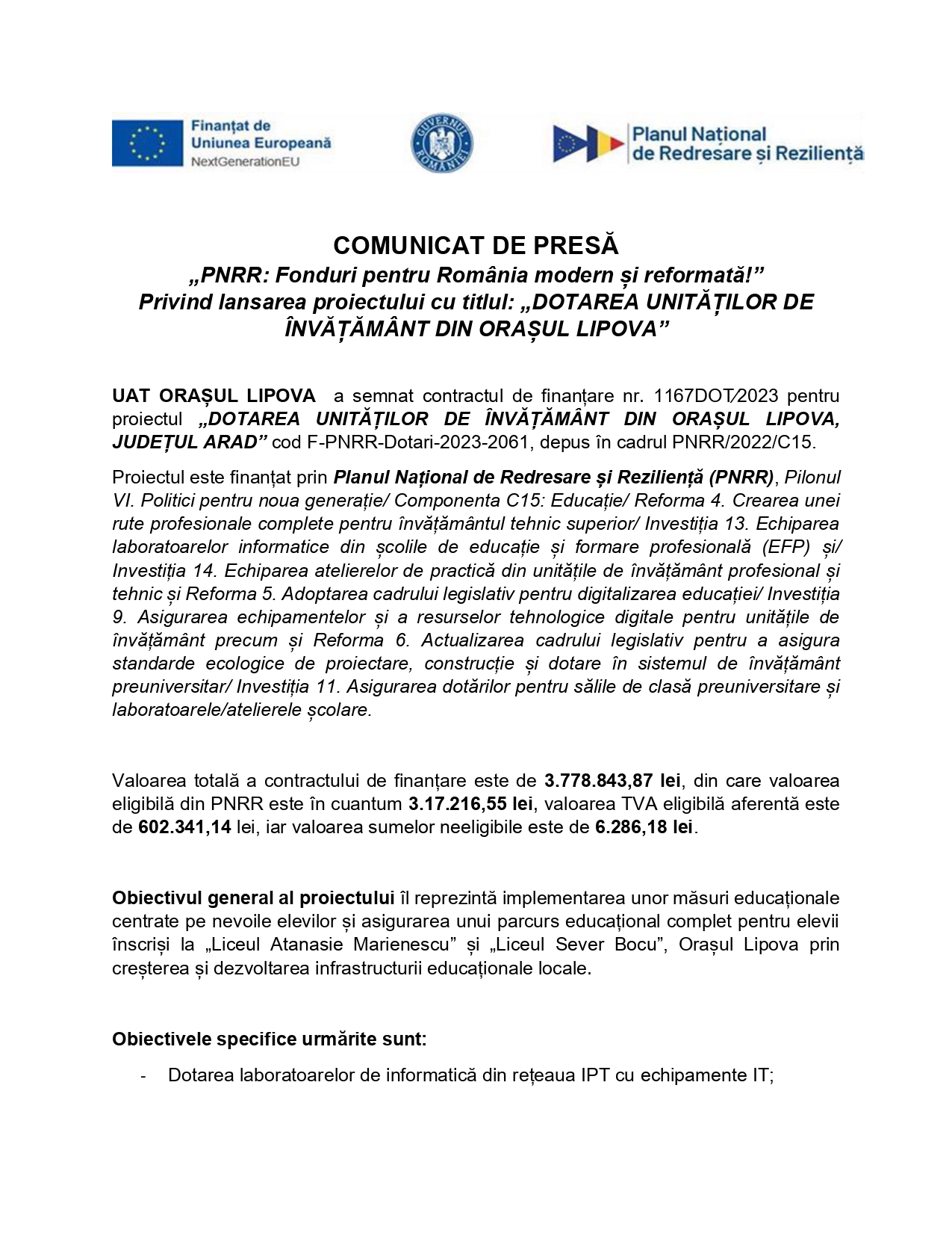 UAT ORAȘUL LIPOVA a semnat contractul de finanțare nr. 1167DOT⁄2023 pentru proiectul „DOTAREA UNITĂȚILOR DE ÎNVĂȚĂMÂNT DIN ORAȘUL LIPOVA, JUDEȚUL ARAD” cod F-PNRR-Dotari-2023-2061, depus în cadrul PNRR/2022/C15.
