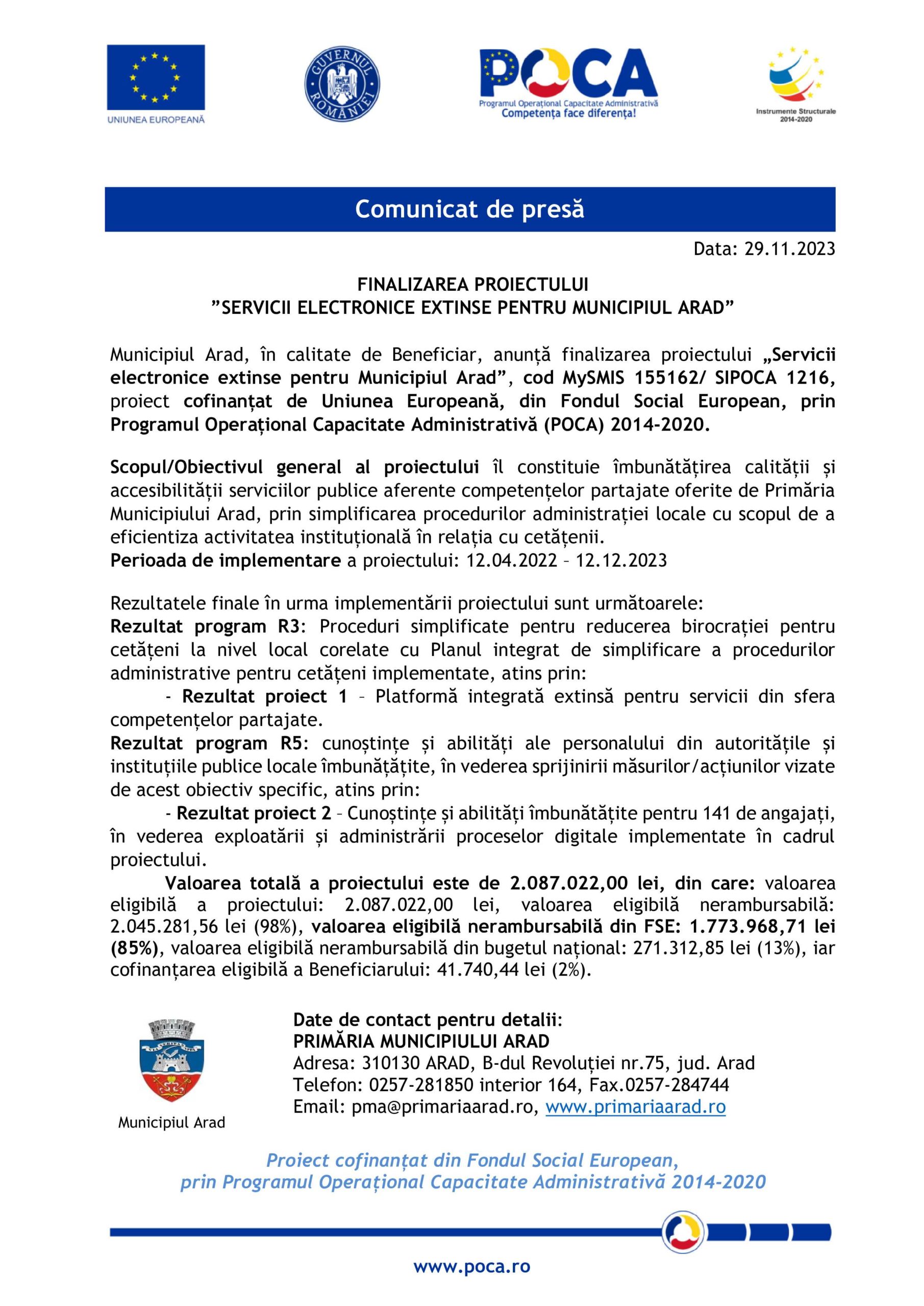 Municipiul Arad, în calitate de Beneficiar, anunță finalizarea proiectului „Servicii electronice extinse pentru Municipiul Arad”, cod MySMIS 155162/ SIPOCA 1216, proiect cofinanțat de Uniunea Europeană, din Fondul Social European, prin Programul Operațional Capacitate Administrativă (POCA) 2014-2020.