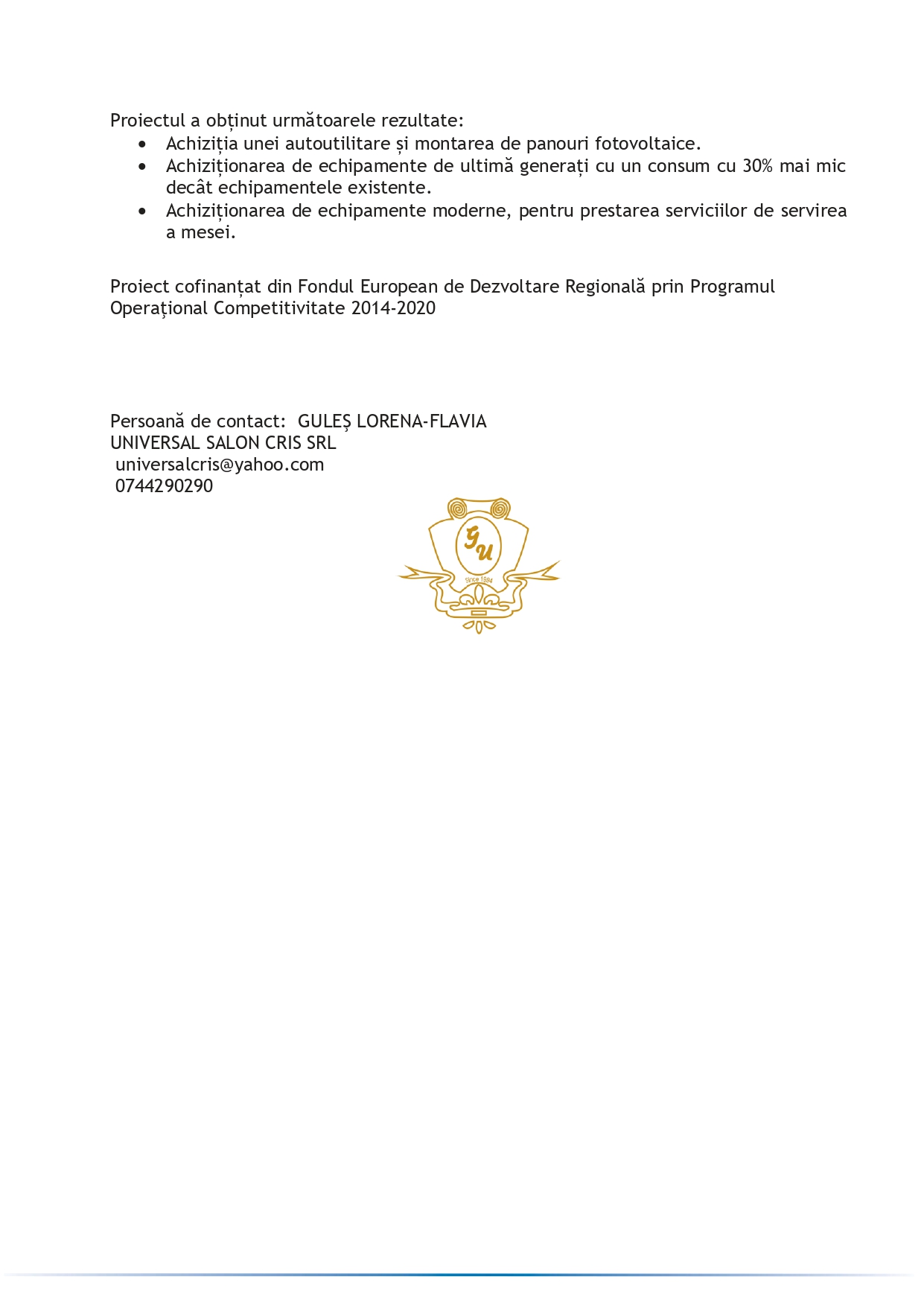 Societatea UNIVERSAL SALON CRIS SRL, CUI 36577566, înregistrată sub numărul J2/1210/2016 la Registrul Comerțului, în calitate de Beneficiar, anunță finalizarea proiectul cu titlul ” Investiții în activități productive pentru consolidarea poziției pe piață a UNIVERSAL SALON CRIS SRL”, Cod SMIS 160482, finanțat prin Programul Operațional Competitivitate 2014-2020, Axa Prioritara 4 – Sprijinirea ameliorării efectelor provocate de criză în contextul pandemiei de COVID-19 și al consecințelor sale sociale și pregătirea unei redresări verzi, digitale și reziliente a economiei, Prioritatea de investiții: Sprijinirea ameliorării efectelor provocate de criză în contextul pandemiei de COVID-19 și consecințelor sale sociale și pregătirea unei redresări verzi, digitale și reziliente a economiei”, Acțiunea 4.1.1 Investiții în activități productive.