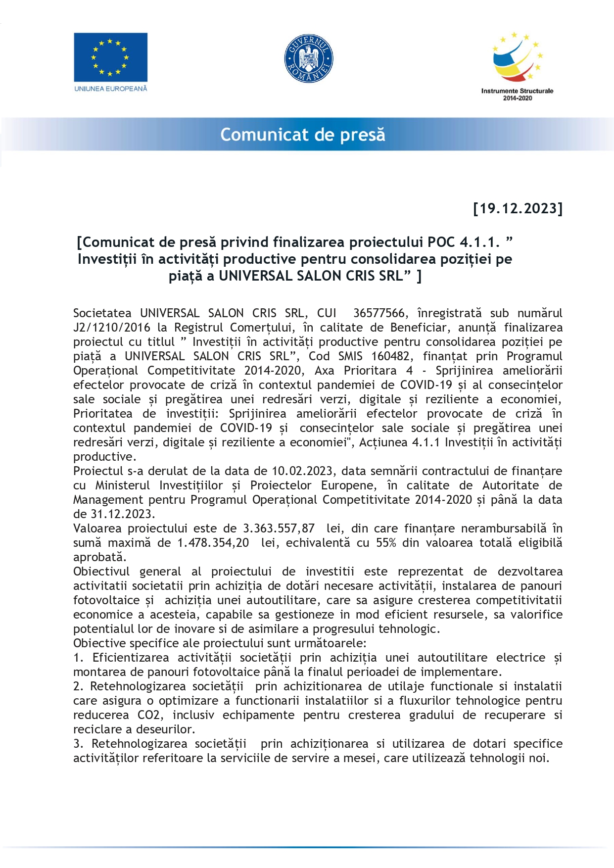 Societatea UNIVERSAL SALON CRIS SRL, CUI 36577566, înregistrată sub numărul J2/1210/2016 la Registrul Comerțului, în calitate de Beneficiar, anunță finalizarea proiectul cu titlul ” Investiții în activități productive pentru consolidarea poziției pe piață a UNIVERSAL SALON CRIS SRL”, Cod SMIS 160482, finanțat prin Programul Operațional Competitivitate 2014-2020, Axa Prioritara 4 – Sprijinirea ameliorării efectelor provocate de criză în contextul pandemiei de COVID-19 și al consecințelor sale sociale și pregătirea unei redresări verzi, digitale și reziliente a economiei, Prioritatea de investiții: Sprijinirea ameliorării efectelor provocate de criză în contextul pandemiei de COVID-19 și consecințelor sale sociale și pregătirea unei redresări verzi, digitale și reziliente a economiei”, Acțiunea 4.1.1 Investiții în activități productive.