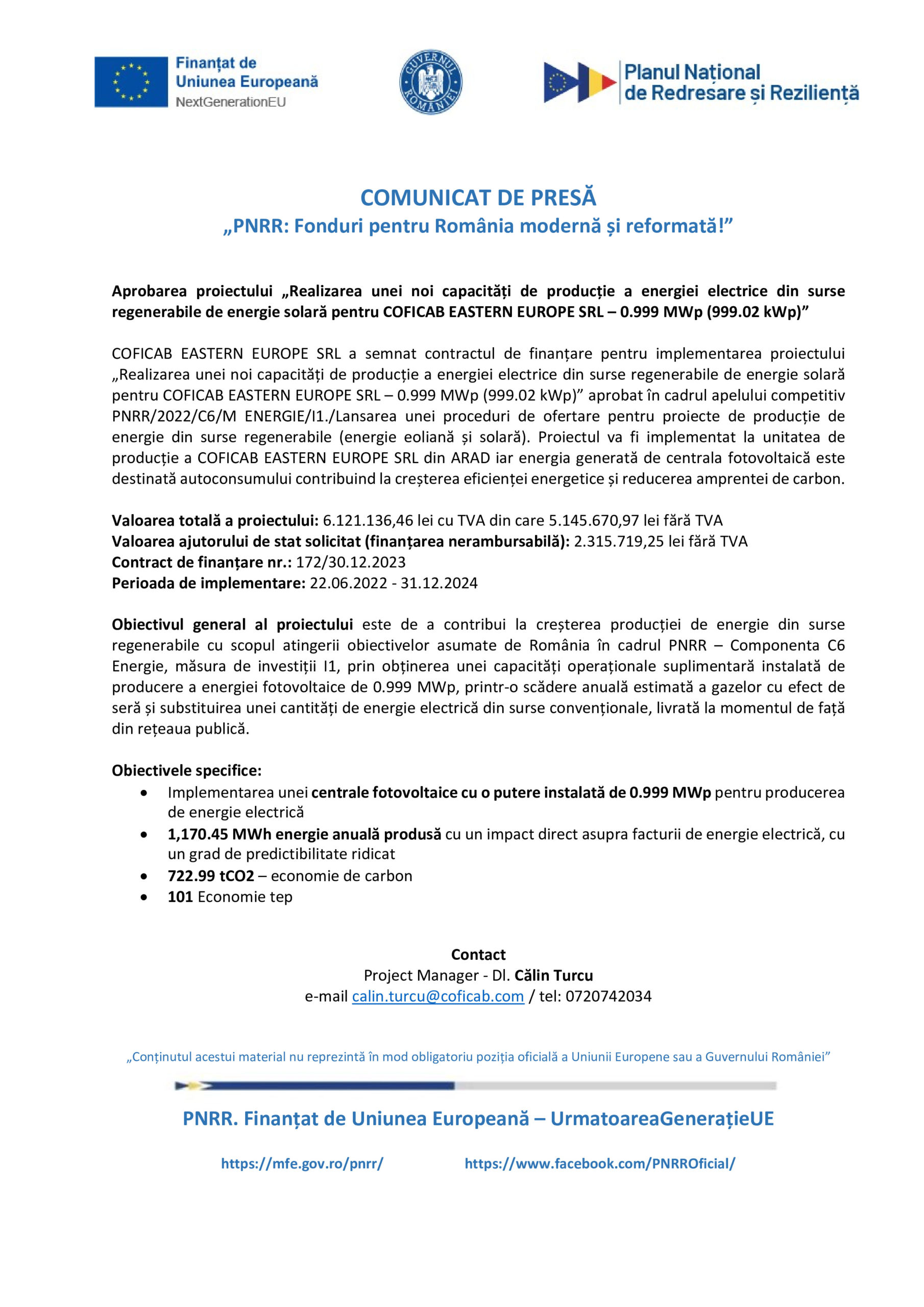 COFICAB EASTERN EUROPE SRL a semnat contractul de finanțare pentru implementarea proiectului „Realizarea unei noi capacități de producție a energiei electrice din surse regenerabile de energie solară pentru COFICAB EASTERN EUROPE SRL – 0.999 MWp (999.02 kWp)” aprobat în cadrul apelului competitiv PNRR/2022/C6/M ENERGIE/I1./Lansarea unei proceduri de ofertare pentru proiecte de producție de energie din surse regenerabile (energie eoliană și solară). Proiectul va fi implementat la unitatea de producție a COFICAB EASTERN EUROPE SRL din ARAD iar energia generată de centrala fotovoltaică este destinată autoconsumului contribuind la creșterea eficienței energetice și reducerea amprentei de carbon.