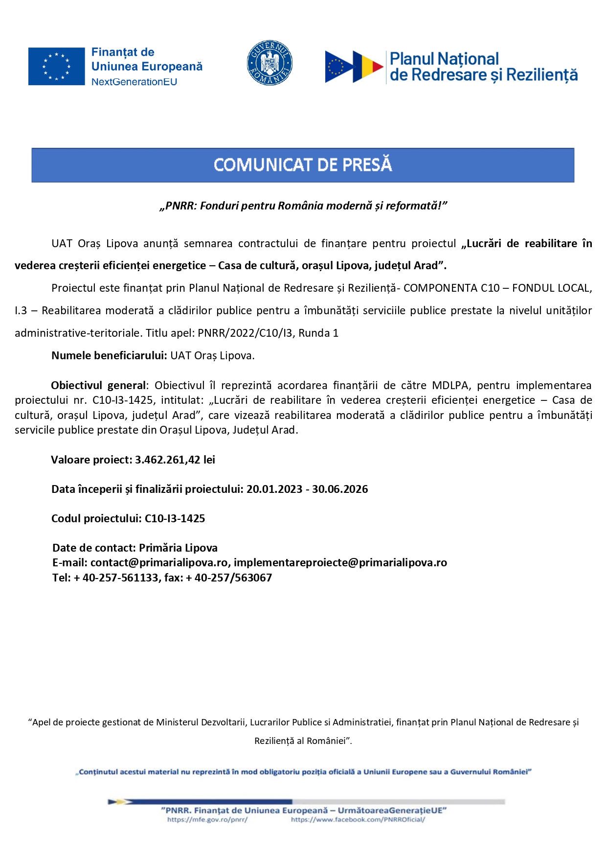 Proiectul este finanțat prin Planul Național de Redresare și Reziliență- COMPONENTA C10 – FONDUL LOCAL, I.3 – Reabilitarea moderată a clădirilor publice pentru a îmbunătăți serviciile publice prestate la nivelul unităților administrative-teritoriale. Titlu apel: PNRR/2022/C10/I3, Runda 1