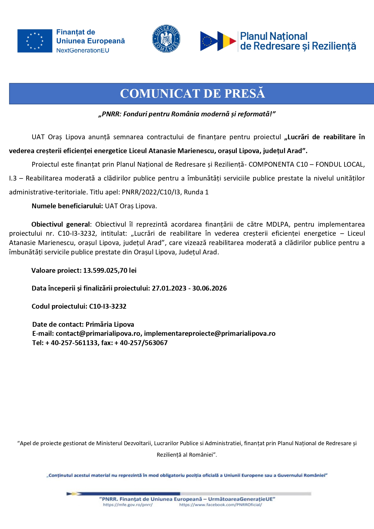 Obiectivul general: Obiectivul îl reprezintă acordarea finanțării de către MDLPA, pentru implementarea proiectului nr. C10-I3-3232, intitulat: „Lucrări de reabilitare în vederea creșterii eficienței energetice – Liceul Atanasie Marienescu, orașul Lipova, județul Arad”, care vizează reabilitarea moderată a clădirilor publice pentru a îmbunătăți servicile publice prestate din Orașul Lipova, Județul Arad.