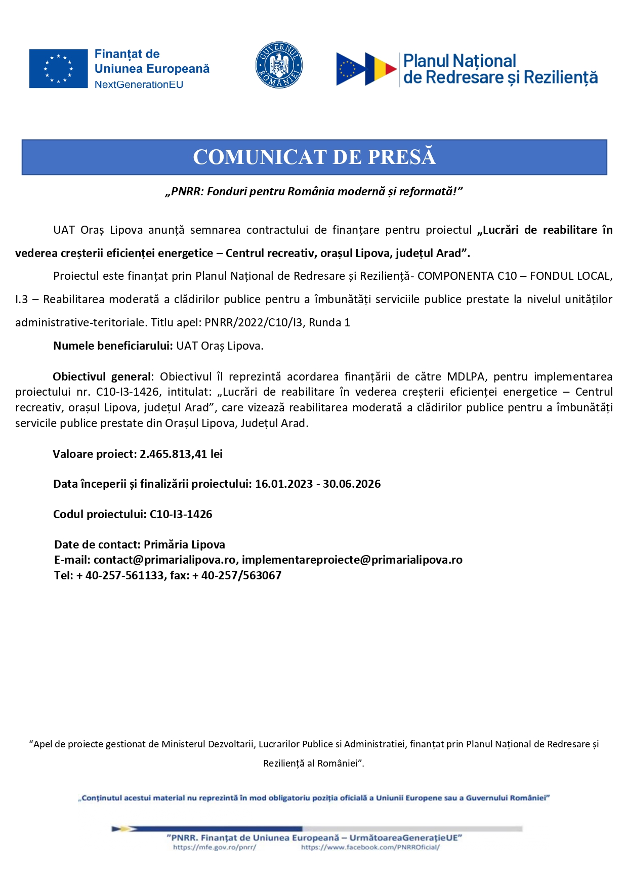 Proiectul este finanțat prin Planul Național de Redresare și Reziliență- COMPONENTA C10 – FONDUL LOCAL, I.3 – Reabilitarea moderată a clădirilor publice pentru a îmbunătăți serviciile publice prestate la nivelul unităților administrative-teritoriale. Titlu apel: PNRR/2022/C10/I3, Runda 1
