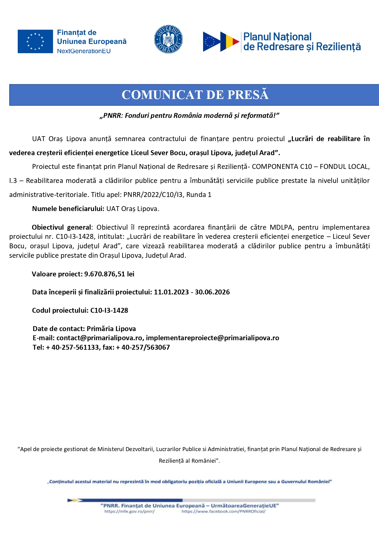 UAT Oraș Lipova anunță semnarea contractului de finanțare pentru proiectul „Lucrări de reabilitare în vederea creșterii eficienței energetice Liceul Sever Bocu, orașul Lipova, județul Arad”.