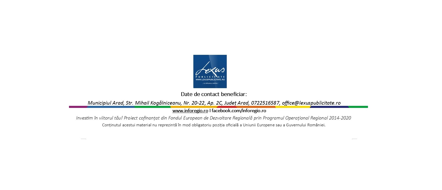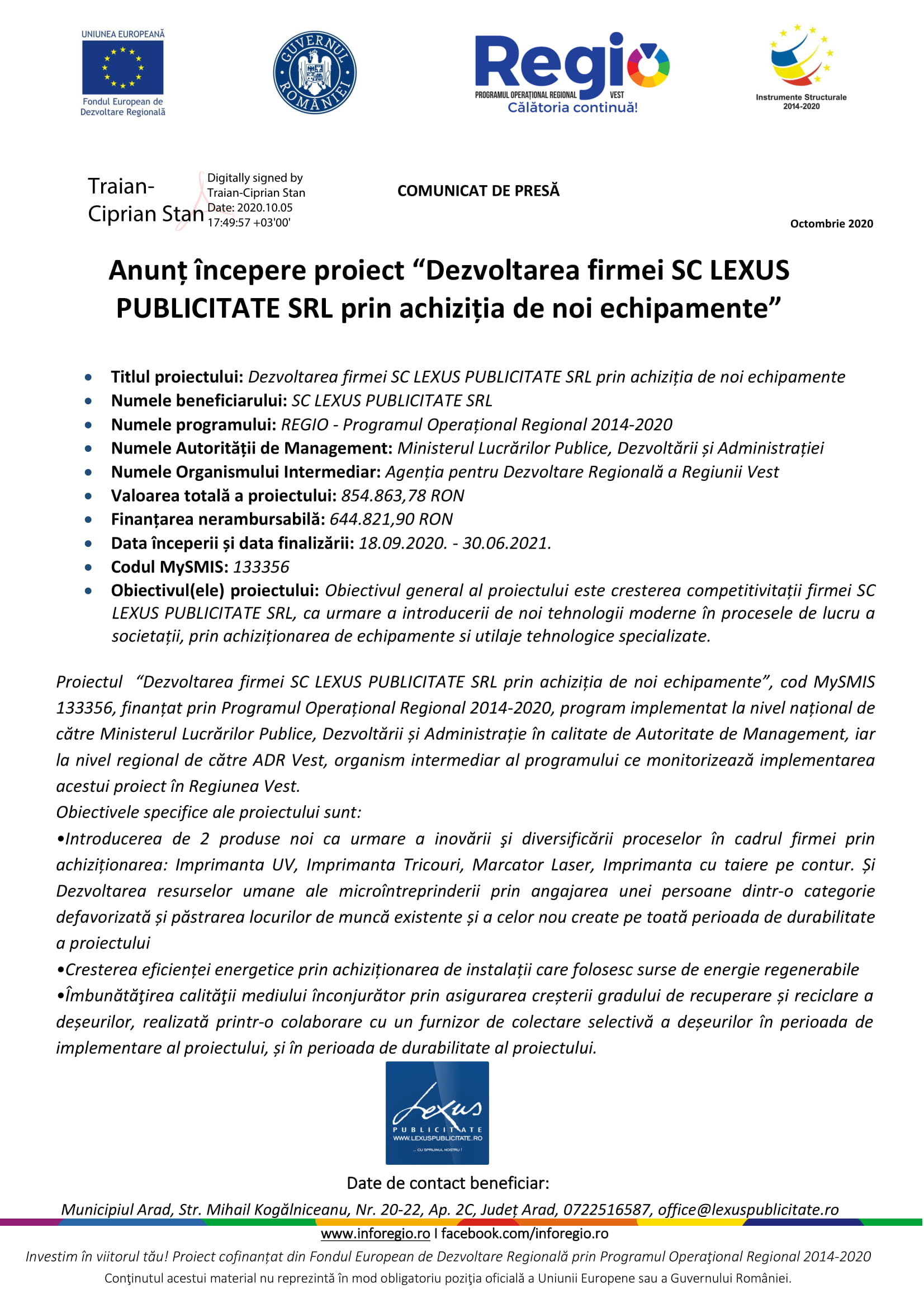 Proiectul “Dezvoltarea firmei SC LEXUS PUBLICITATE SRL prin achiziția de noi echipamente”, cod MySMIS 133356, finanțat prin Programul Operațional Regional 2014-2020, program implementat la nivel național de către Ministerul Lucrărilor Publice, Dezvoltării și Administrație în calitate de Autoritate de Management, iar la nivel regional de către ADR Vest, organism intermediar al programului ce monitorizează implementarea acestui proiect în Regiunea Vest.
