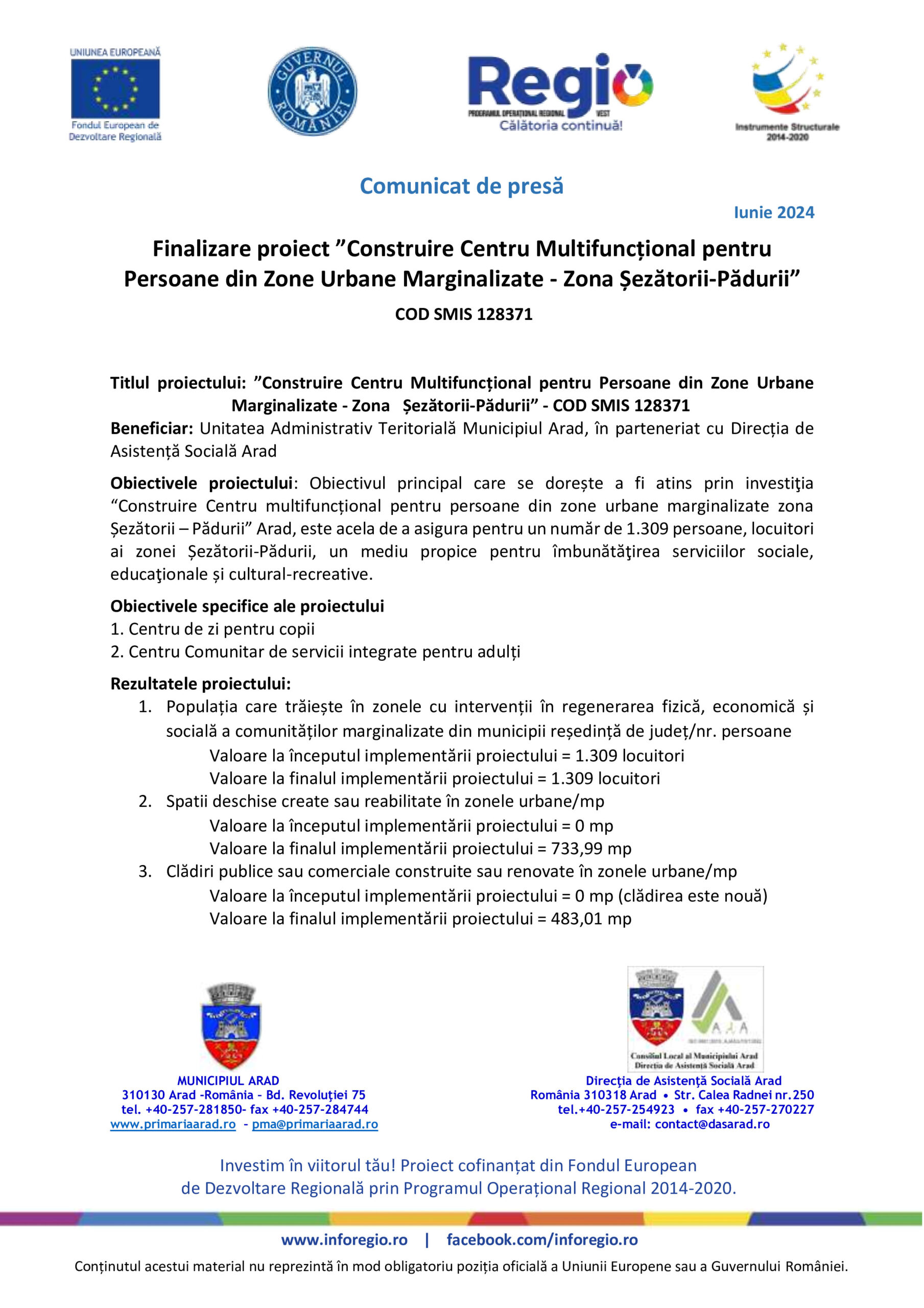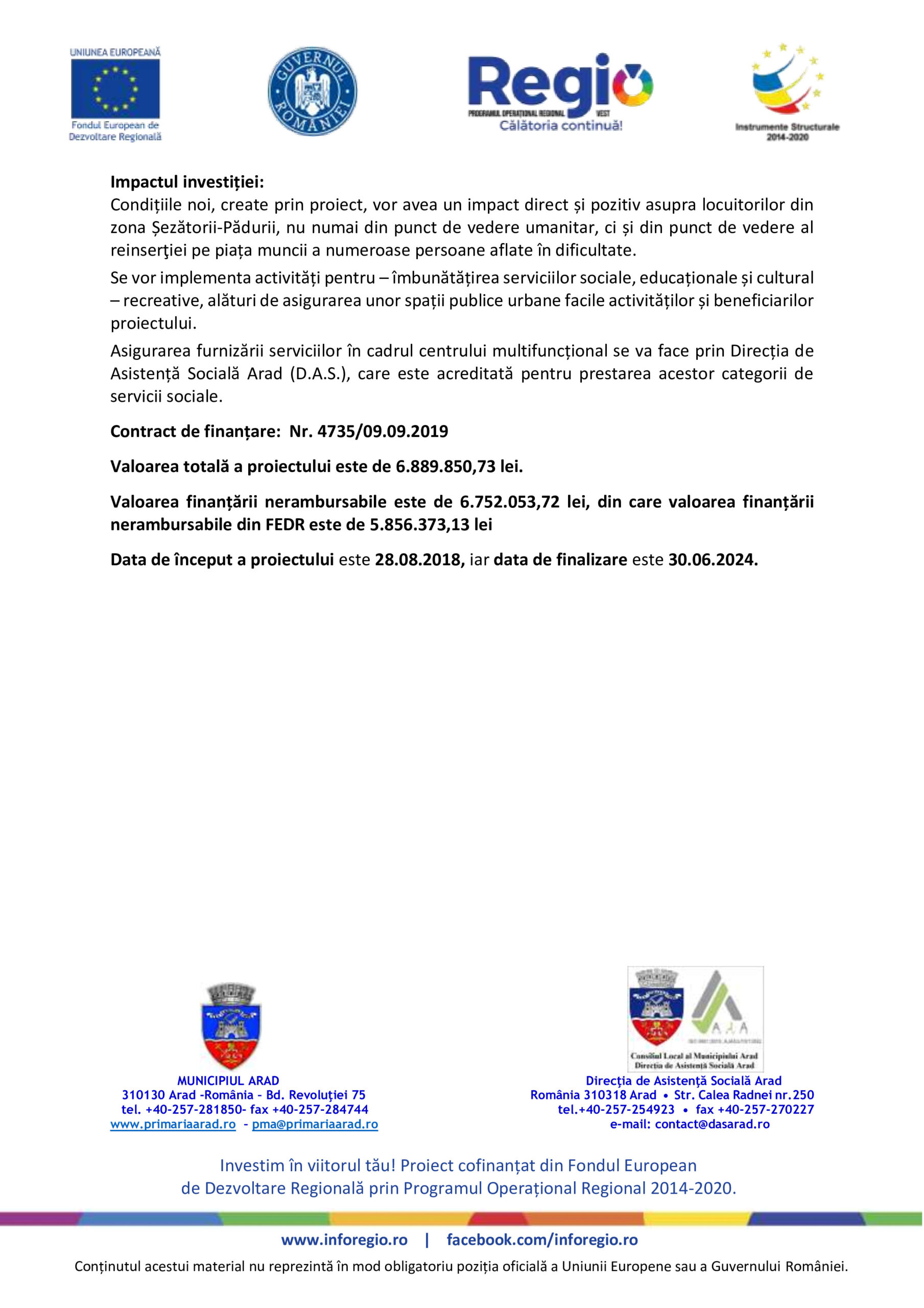 Beneficiar: Unitatea Administrativ Teritorială Municipiul Arad, în parteneriat cu Direcția de Asistență Socială Arad