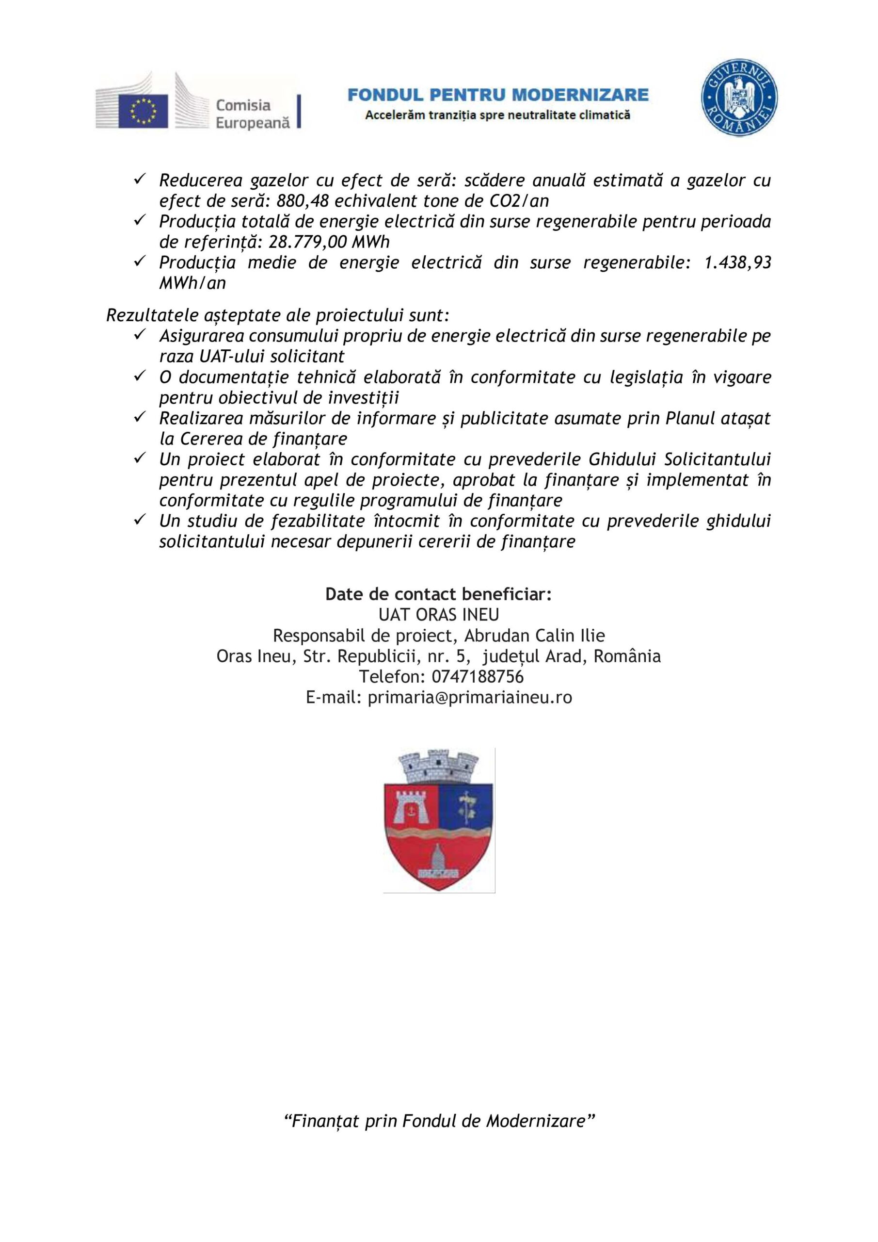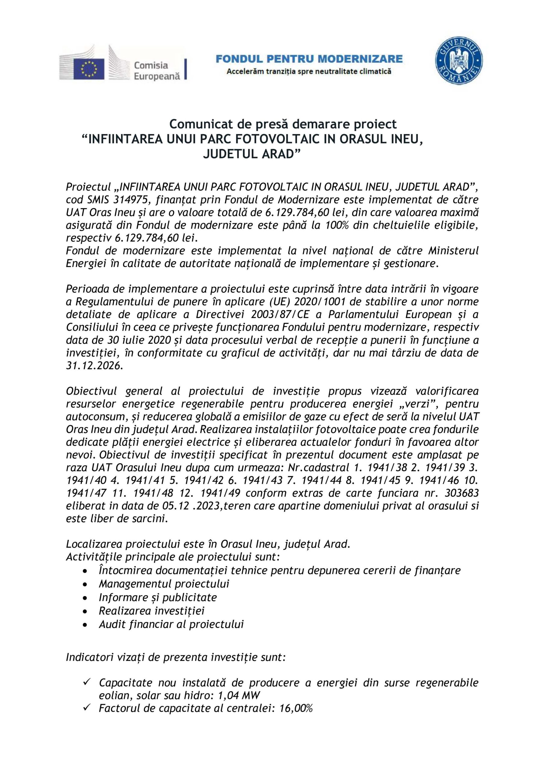 Proiectul „INFIINTAREA UNUI PARC FOTOVOLTAIC IN ORASUL INEU, JUDETUL ARAD”, cod SMIS 314975, finanțat prin Fondul de Modernizare este implementat de către UAT Oras Ineu și are o valoare totală de 6.129.784,60 lei, din care valoarea maximă asigurată din Fondul de modernizare este până la 100% din cheltuielile eligibile, respectiv 6.129.784,60 lei.