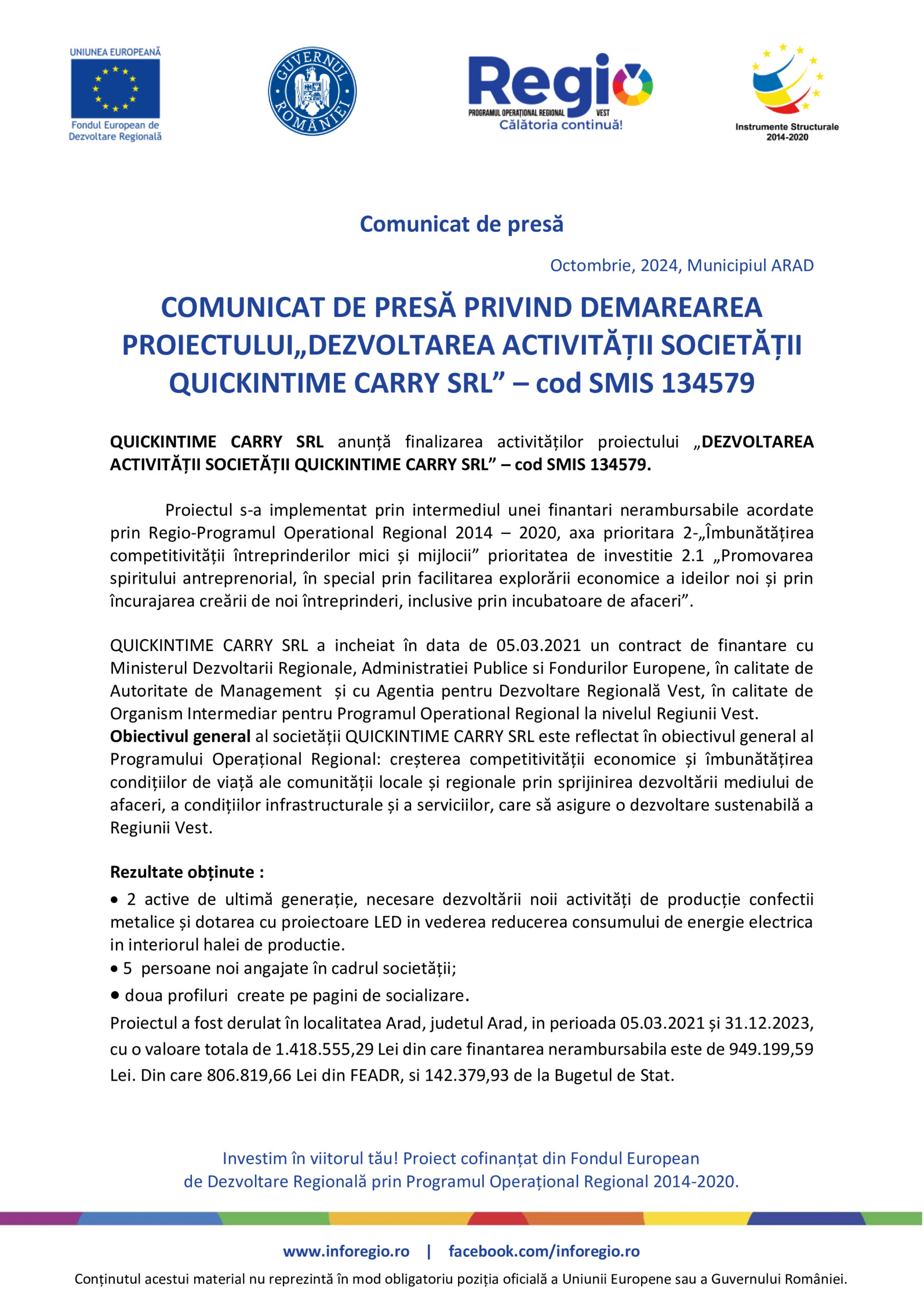 QUICKINTIME CARRY SRL a incheiat în data de 05.03.2021 un contract de finantare cu Ministerul Dezvoltarii Regionale, Administratiei Publice si Fondurilor Europene, în calitate de Autoritate de Management și cu Agentia pentru Dezvoltare Regională Vest, în calitate de Organism Intermediar pentru Programul Operational Regional la nivelul Regiunii Vest.