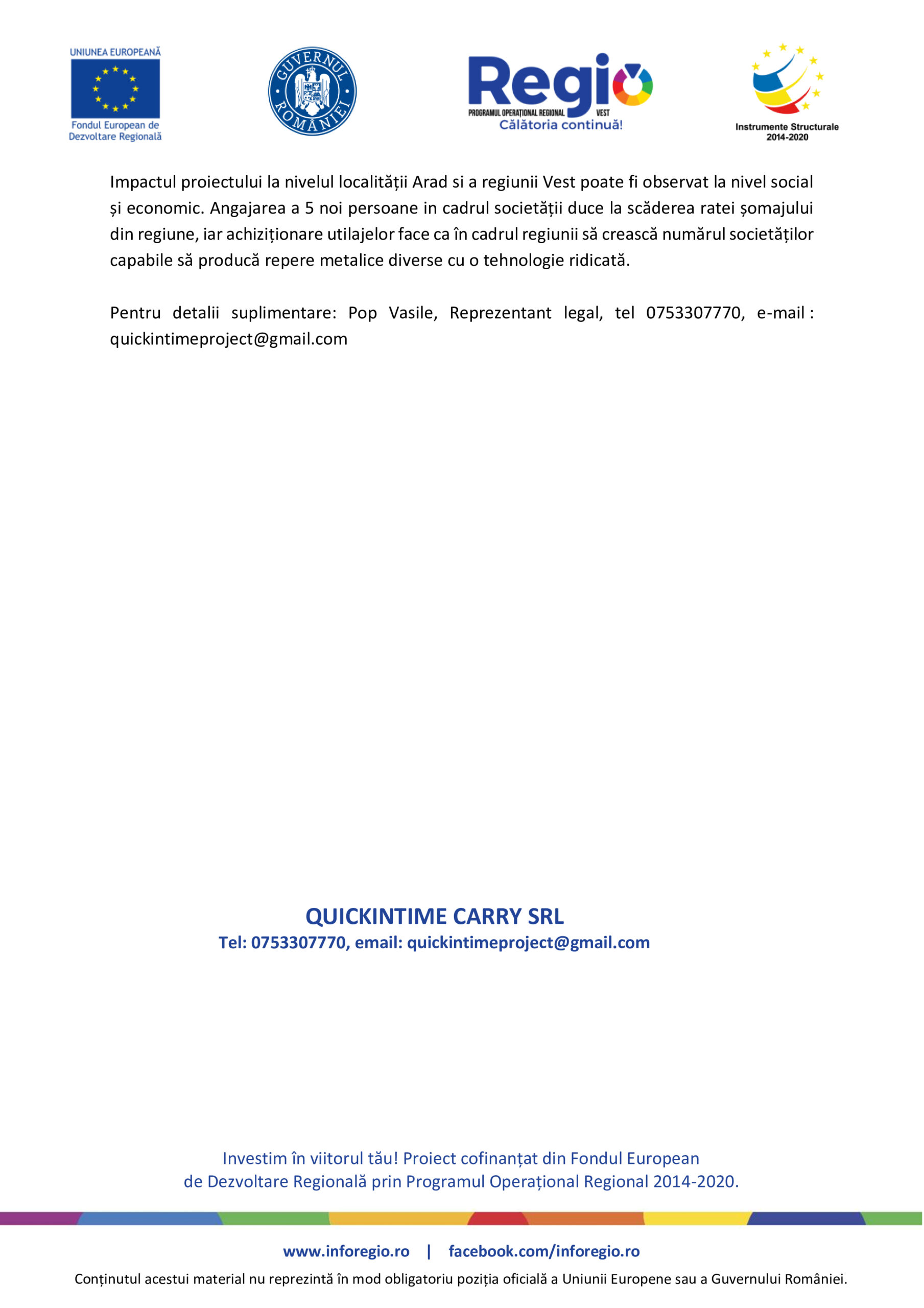 Pentru detalii suplimentare: Pop Vasile, Reprezentant legal, tel 0753307770, e-mail : quickintimeproject@gmail.com