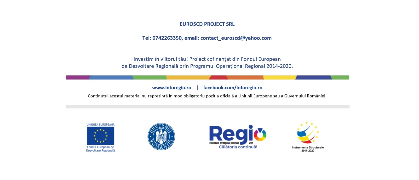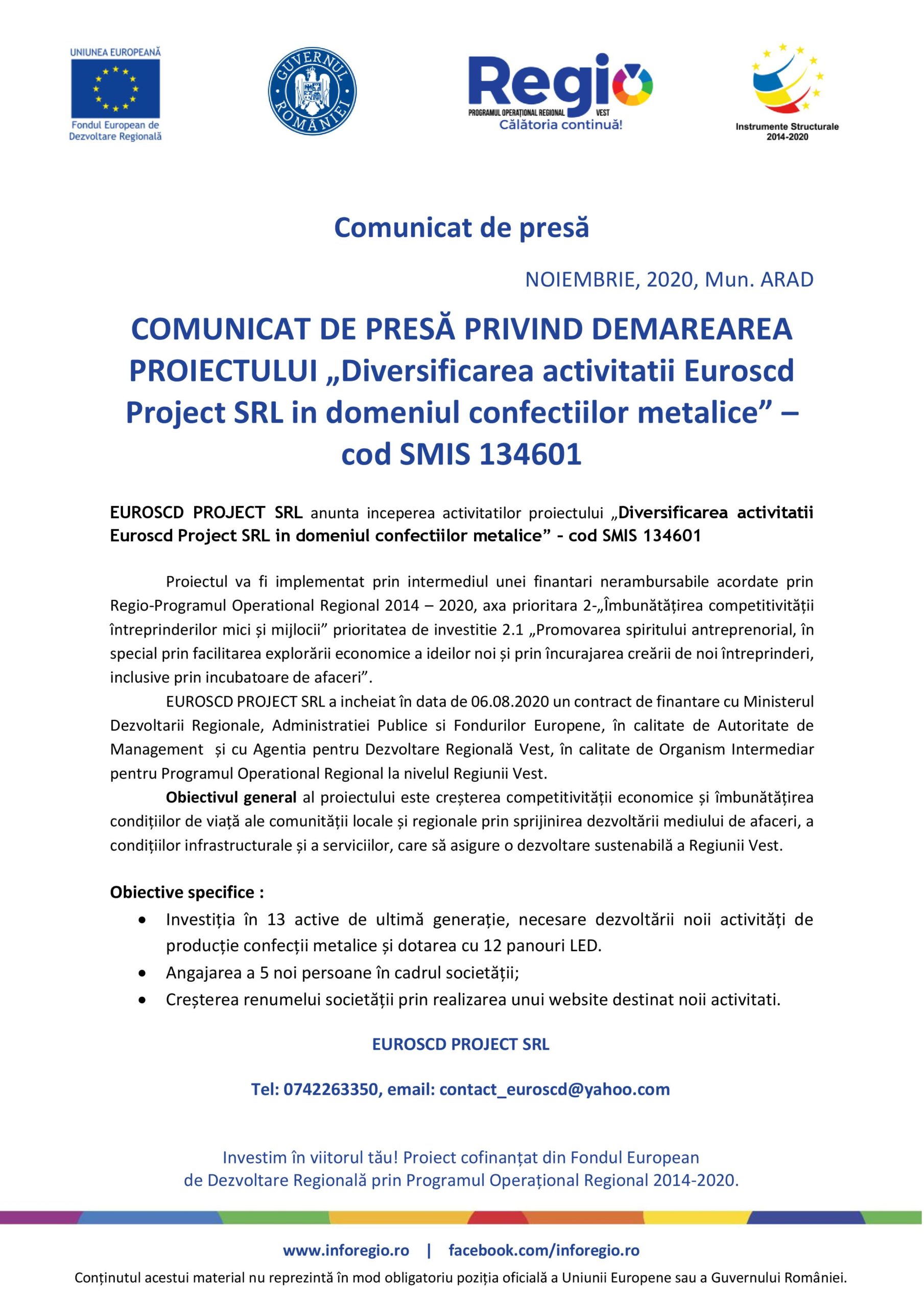 EUROSCD PROJECT SRL a incheiat în data de 06.08.2020 un contract de finantare cu Ministerul Dezvoltarii Regionale, Administratiei Publice si Fondurilor Europene, în calitate de Autoritate de Management și cu Agentia pentru Dezvoltare Regională Vest, în calitate de Organism Intermediar pentru Programul Operational Regional la nivelul Regiunii Vest.