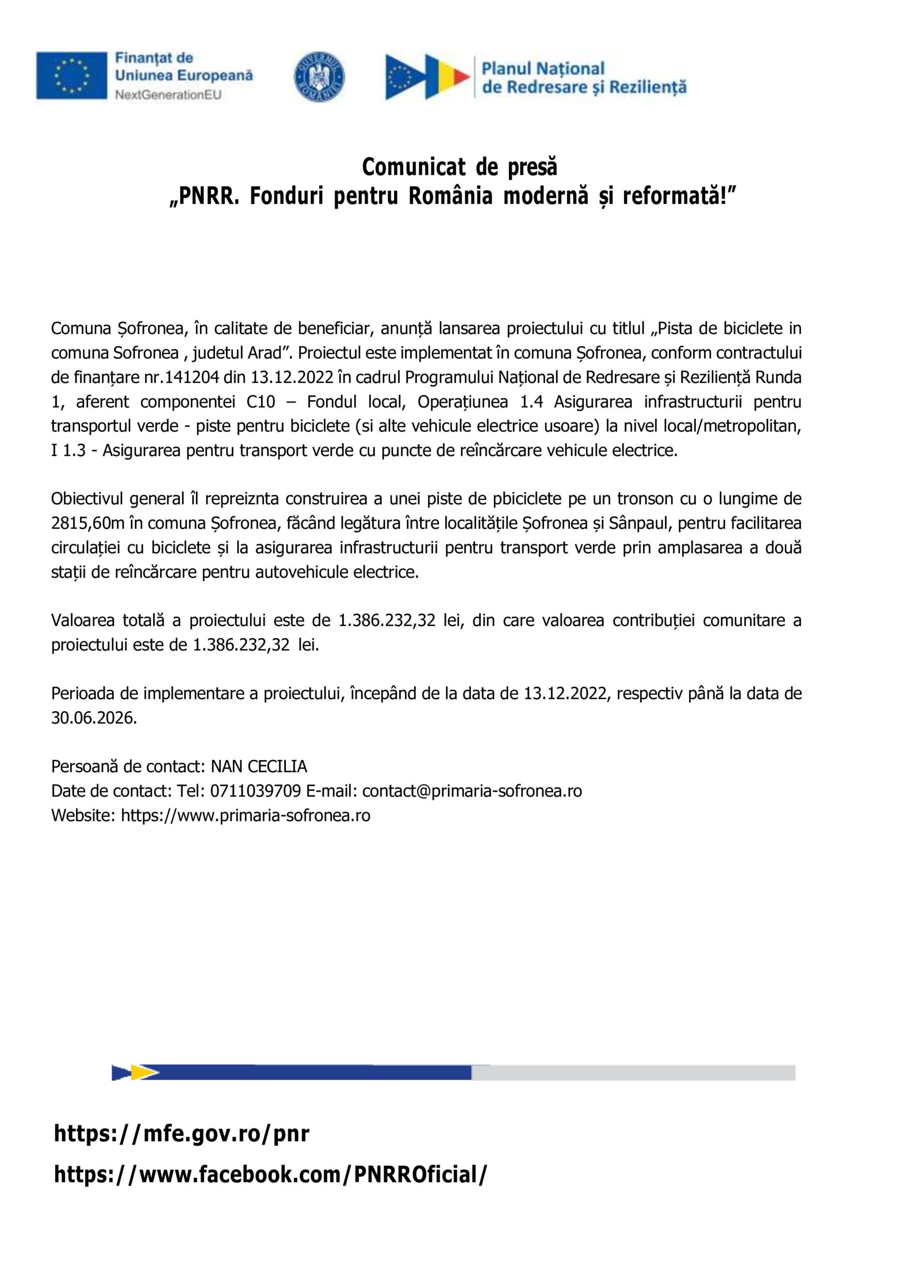 Comuna Șofronea, în calitate de beneficiar, anunță lansarea proiectului cu titlul „Pista de biciclete in comuna Sofronea, judetul Arad”. Proiectul este implementat în comuna Șofronea, conform contractului de finanțare nr.141204 din 13.12.2022 în cadrul Programului Național de Redresare și Reziliență Runda 1, aferent componentei C10 – Fondul local, Operațiunea 1.4 Asigurarea infrastructurii pentru transportul verde – piste pentru biciclete (si alte vehicule electrice usoare) la nivel local/metropolitan, I 1.3 – Asigurarea pentru transport verde cu puncte de reîncărcare vehicule electrice.