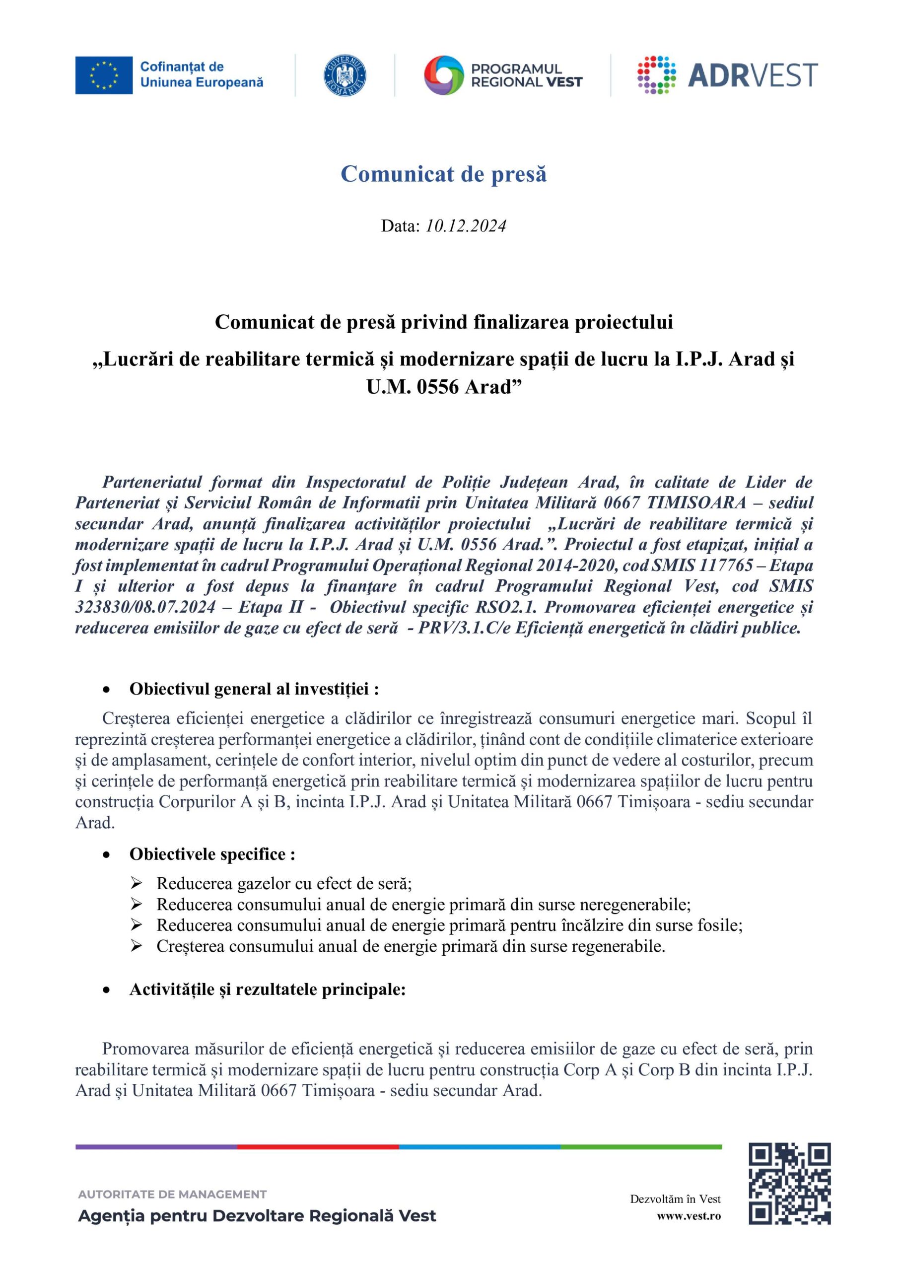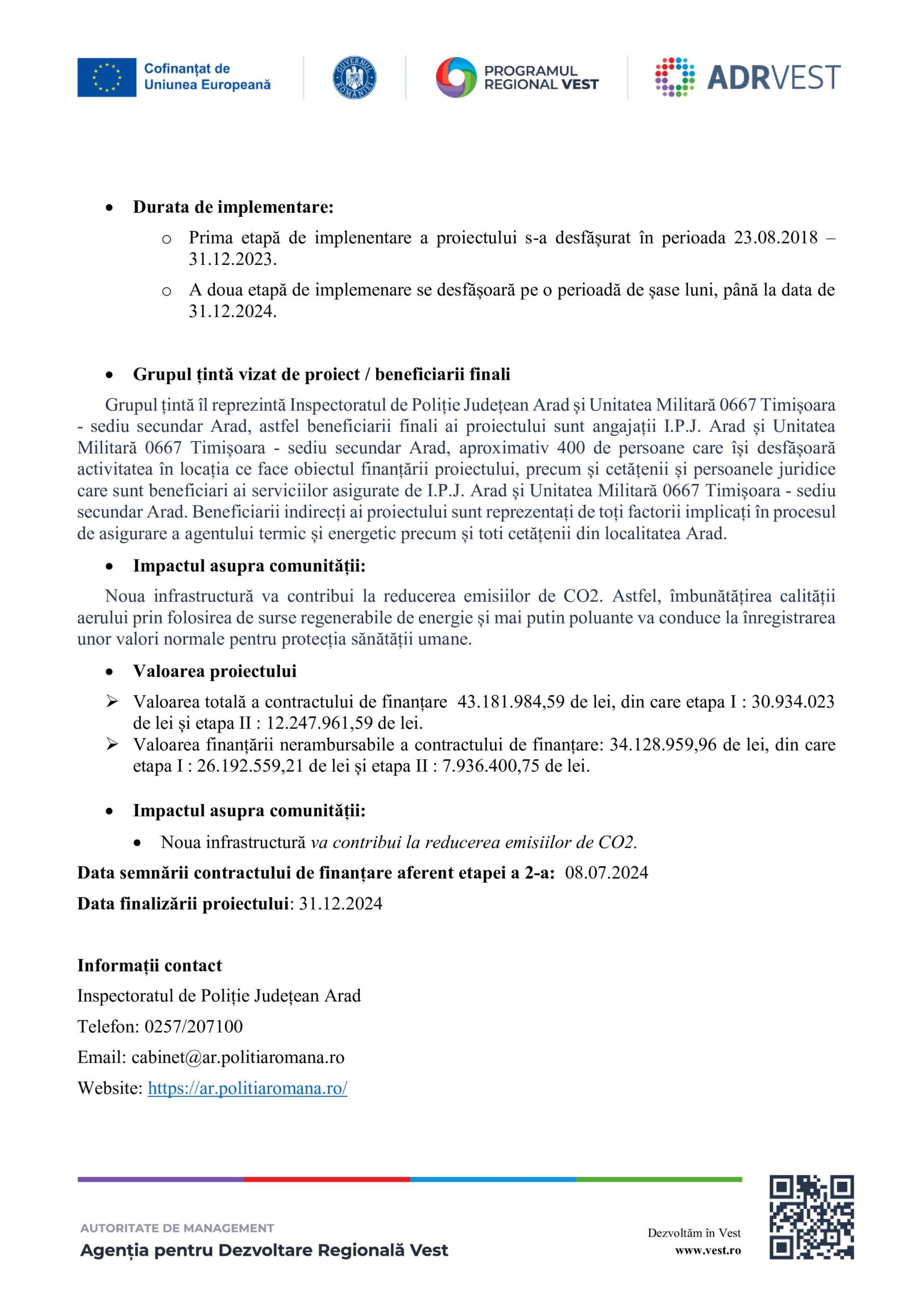 Parteneriatul format din Inspectoratul de Poliție Județean Arad, în calitate de Lider de Parteneriat și Serviciul Român de Informatii prin Unitatea Militară 0667 TIMISOARA – sediul secundar Arad, anunță finalizarea activităților proiectului „Lucrări de reabilitare termică și modernizare spații de lucru la I.P.J. Arad și U.M. 0556 Arad.”. Proiectul a fost etapizat, inițial a fost implementat în cadrul Programului Operațional Regional 2014-2020, cod SMIS 117765 – Etapa I și ulterior a fost depus la finanţare în cadrul Programului Regional Vest, cod SMIS 323830/08.07.2024 – Etapa II – Obiectivul specific RSO2.1. Promovarea eficienței energetice și reducerea emisiilor de gaze cu efect de seră – PRV/3.1.C/e Eficiență energetică în clădiri publice.