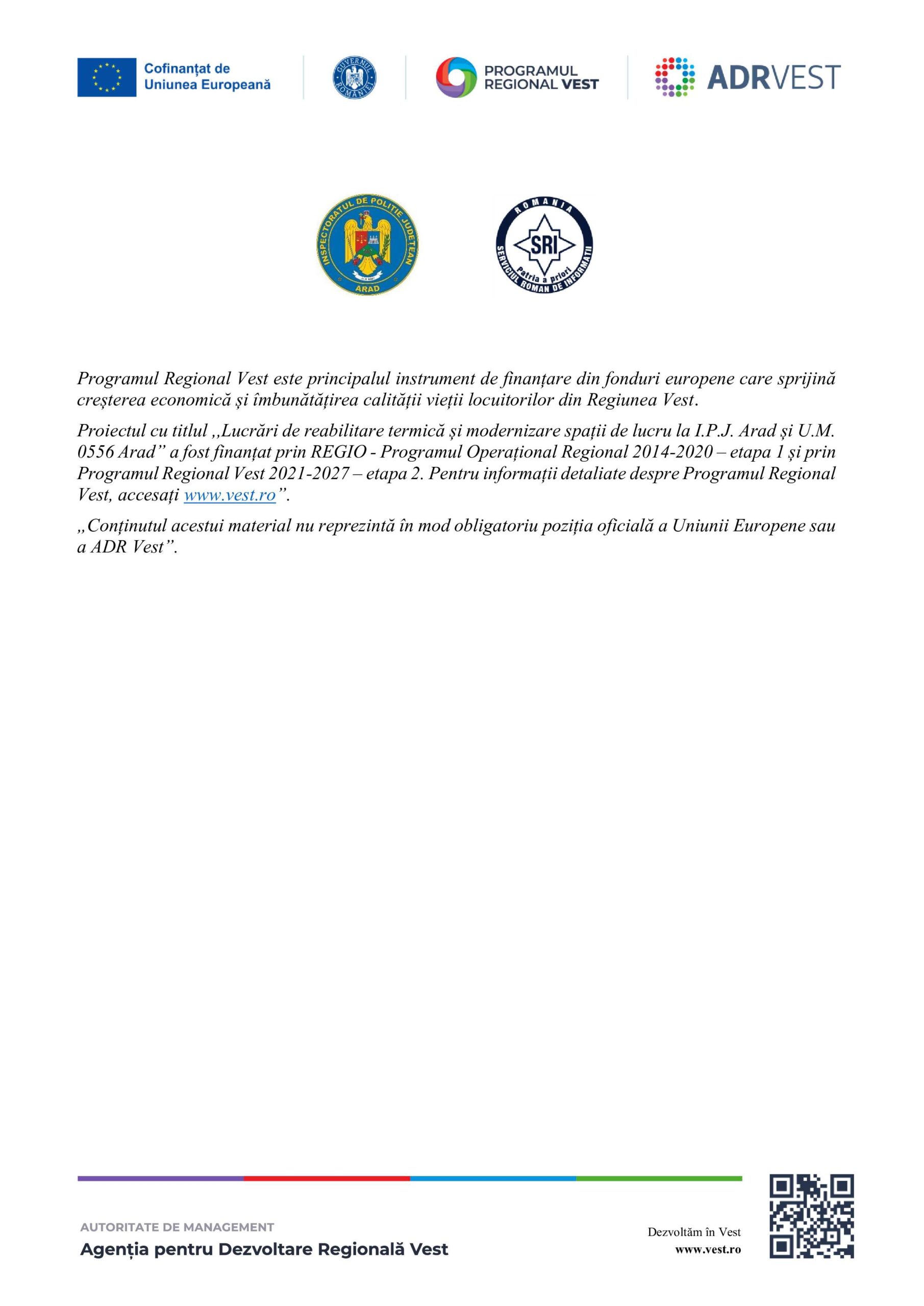 Proiectul cu titlul ,,Lucrări de reabilitare termică și modernizare spații de lucru la I.P.J. Arad și U.M. 0556 Arad” a fost finanțat prin REGIO – Programul Operațional Regional 2014-2020 – etapa 1 și prin Programul Regional Vest 2021-2027 – etapa 2. Pentru informații detaliate despre Programul Regional Vest, accesați www.vest.ro”.