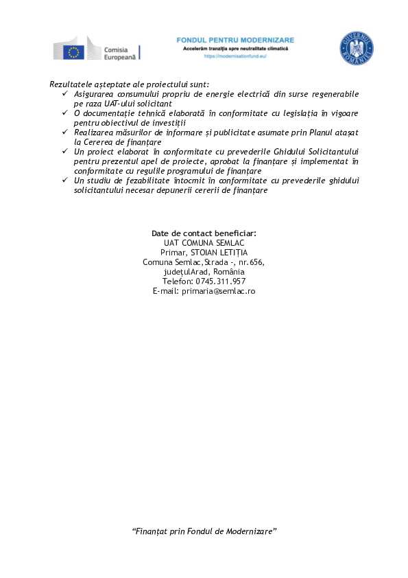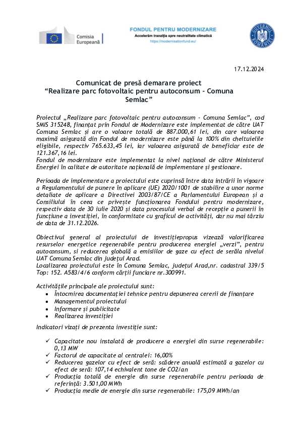 Proiectul „Realizare parc fotovoltaic pentru autoconsum – Comuna Semlac”, cod SMIS 315248, finanțat prin Fondul de Modernizare este implementat de către UAT Comuna Semlac și are o valoare totală de 887.000,61 lei, din care valoarea maximă asigurată din Fondul de modernizare este până la 100% din cheltuielile eligibile, respectiv 765.633,45 lei, iar valoarea asigurată de beneficiar este de 121.367,16 lei.