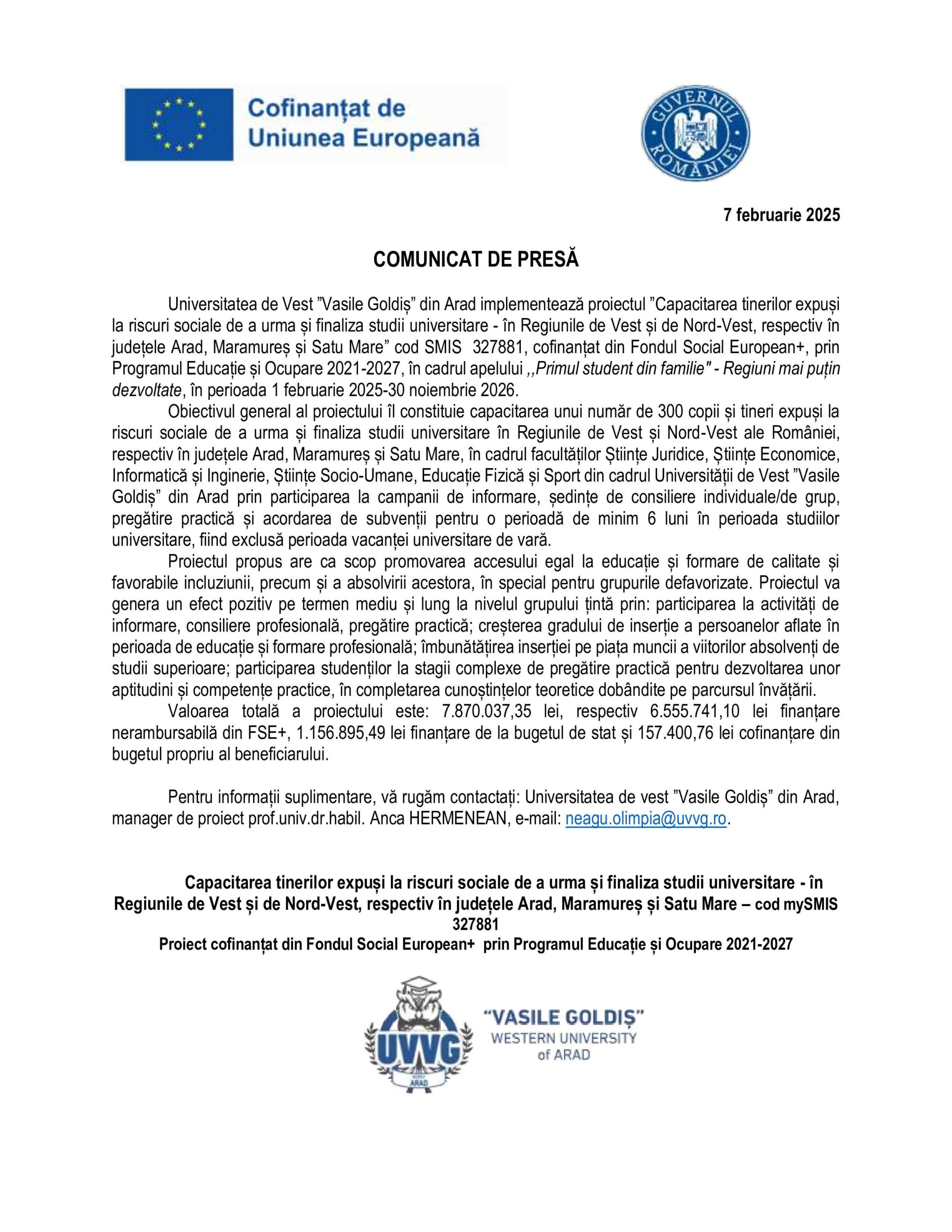 Pentru informații suplimentare, vă rugăm contactați: Universitatea de vest ”Vasile Goldiș” din Arad, manager de proiect prof.univ.dr.habil. Anca HERMENEAN, e-mail: neagu.olimpia@uvvg.ro.