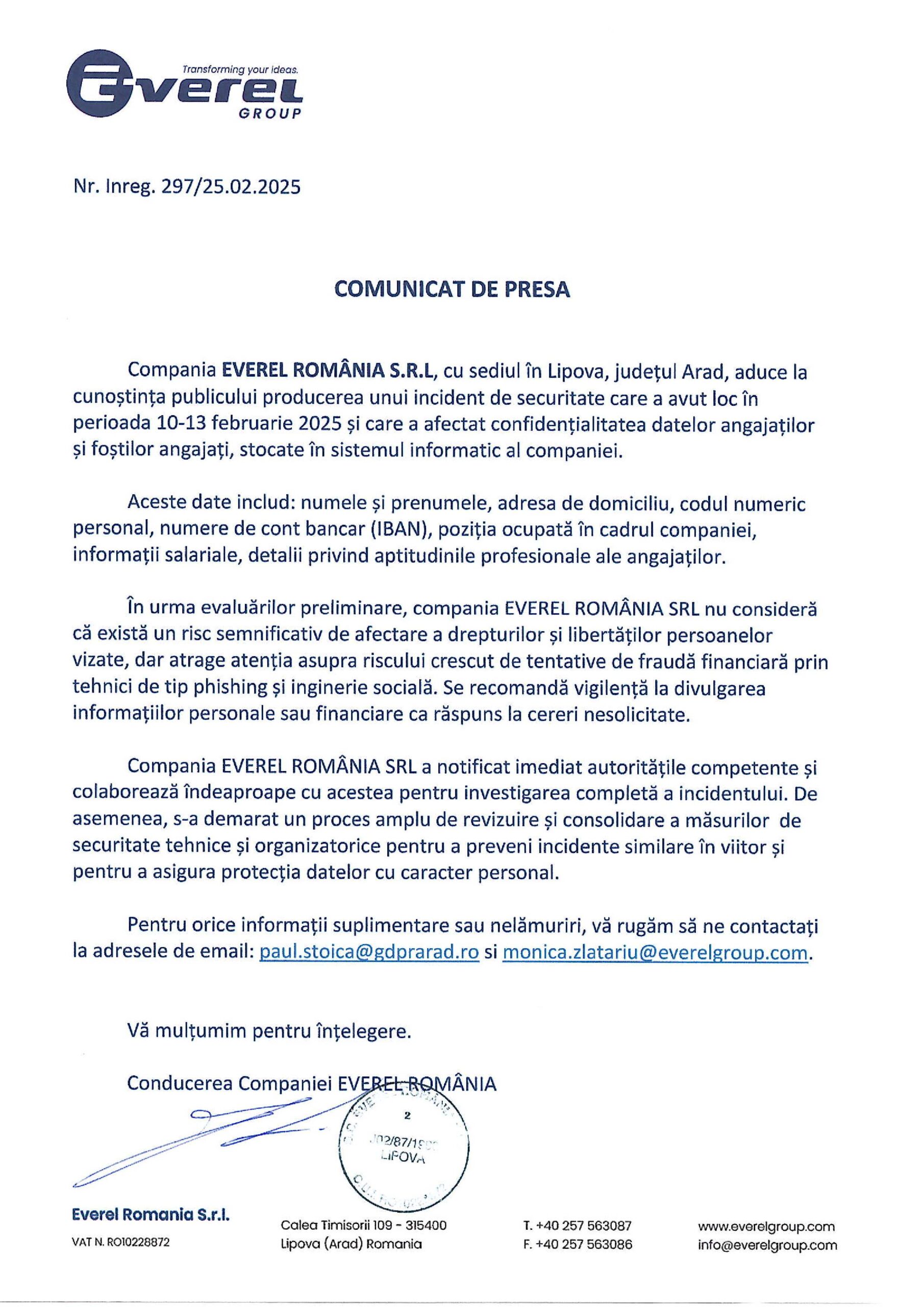 Compania EVEREL ROMÂNIA SRL a notificat imediat autoritățile competente și colaborează îndeaproape cu acestea pentru investigarea completă a incidentului. De asemenea, s-a demarat un proces amplu de revizuire și consolidare a măsurilor de securitate tehnice și organizatorice pentru a preveni incidente similare în viitor și pentru a asigura protecția datelor cu caracter personal.