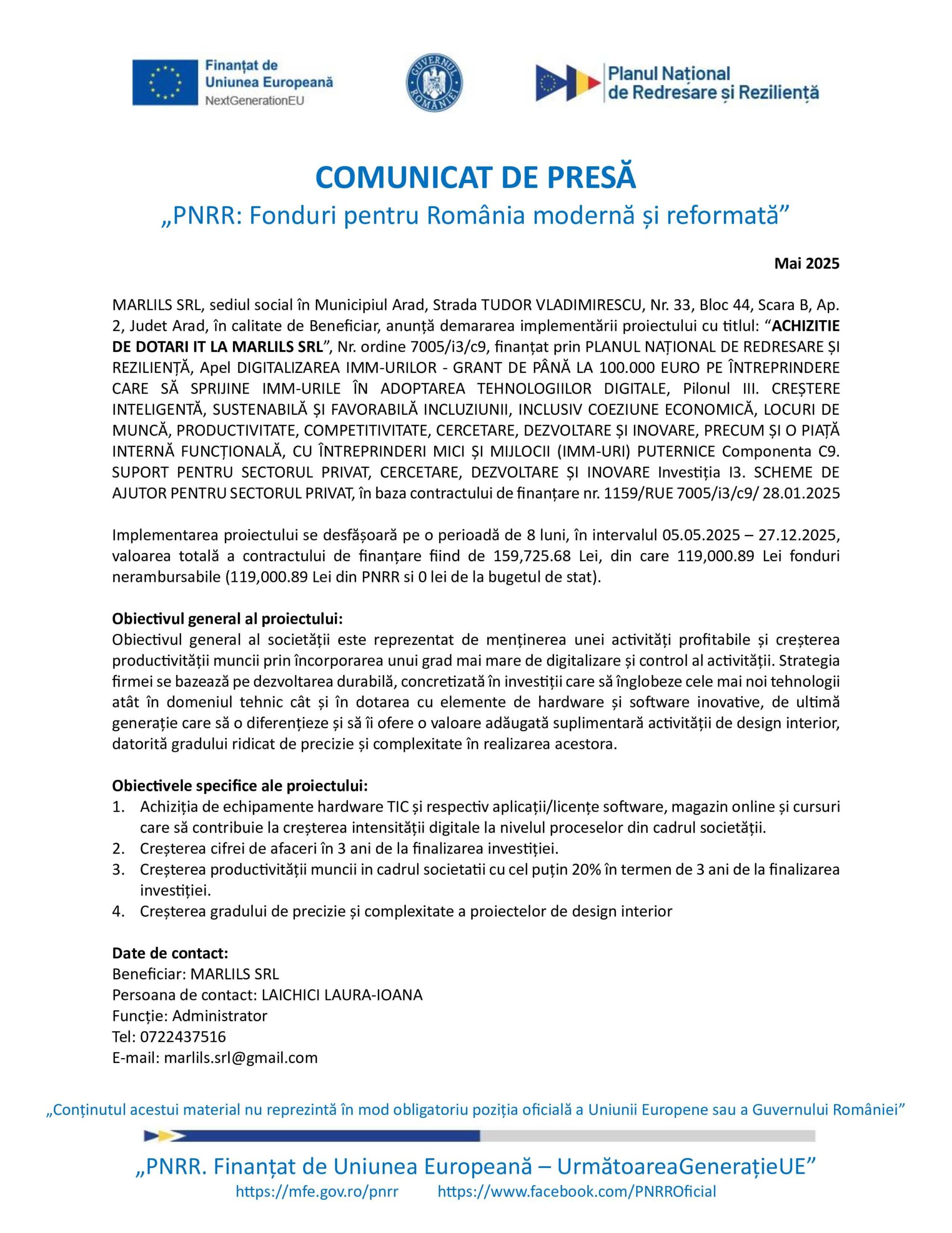 MARLILS SRL, sediul social în Municipiul Arad, Strada TUDOR VLADIMIRESCU, Nr. 33, Bloc 44, Scara B, Ap. 2, Judet Arad, în calitate de Beneficiar, anunță demararea implementării proiectului cu titlul: “ACHIZITIE DE DOTARI IT LA MARLILS SRL”, Nr. ordine 7005/i3/c9, finanțat prin PLANUL NAȚIONAL DE REDRESARE ȘI REZILIENȚĂ, Apel DIGITALIZAREA IMM-URILOR – GRANT DE PÂNĂ LA 100.000 EURO PE ÎNTREPRINDERE CARE SĂ SPRIJINE IMM-URILE ÎN ADOPTAREA TEHNOLOGIILOR DIGITALE, Pilonul III. CREȘTERE INTELIGENTĂ, SUSTENABILĂ ȘI FAVORABILĂ INCLUZIUNII, INCLUSIV COEZIUNE ECONOMICĂ, LOCURI DE MUNCĂ, PRODUCTIVITATE, COMPETITIVITATE, CERCETARE, DEZVOLTARE ȘI INOVARE, PRECUM ȘI O PIAȚĂ INTERNĂ FUNCȚIONALĂ, CU ÎNTREPRINDERI MICI ȘI MIJLOCII (IMM-URI) PUTERNICE Componenta C9. SUPORT PENTRU SECTORUL PRIVAT, CERCETARE, DEZVOLTARE ȘI INOVARE Investiția I3. SCHEME DE AJUTOR PENTRU SECTORUL PRIVAT, în baza contractului de finanțare nr. 1159/RUE 7005/i3/c9/ 28.01.2025