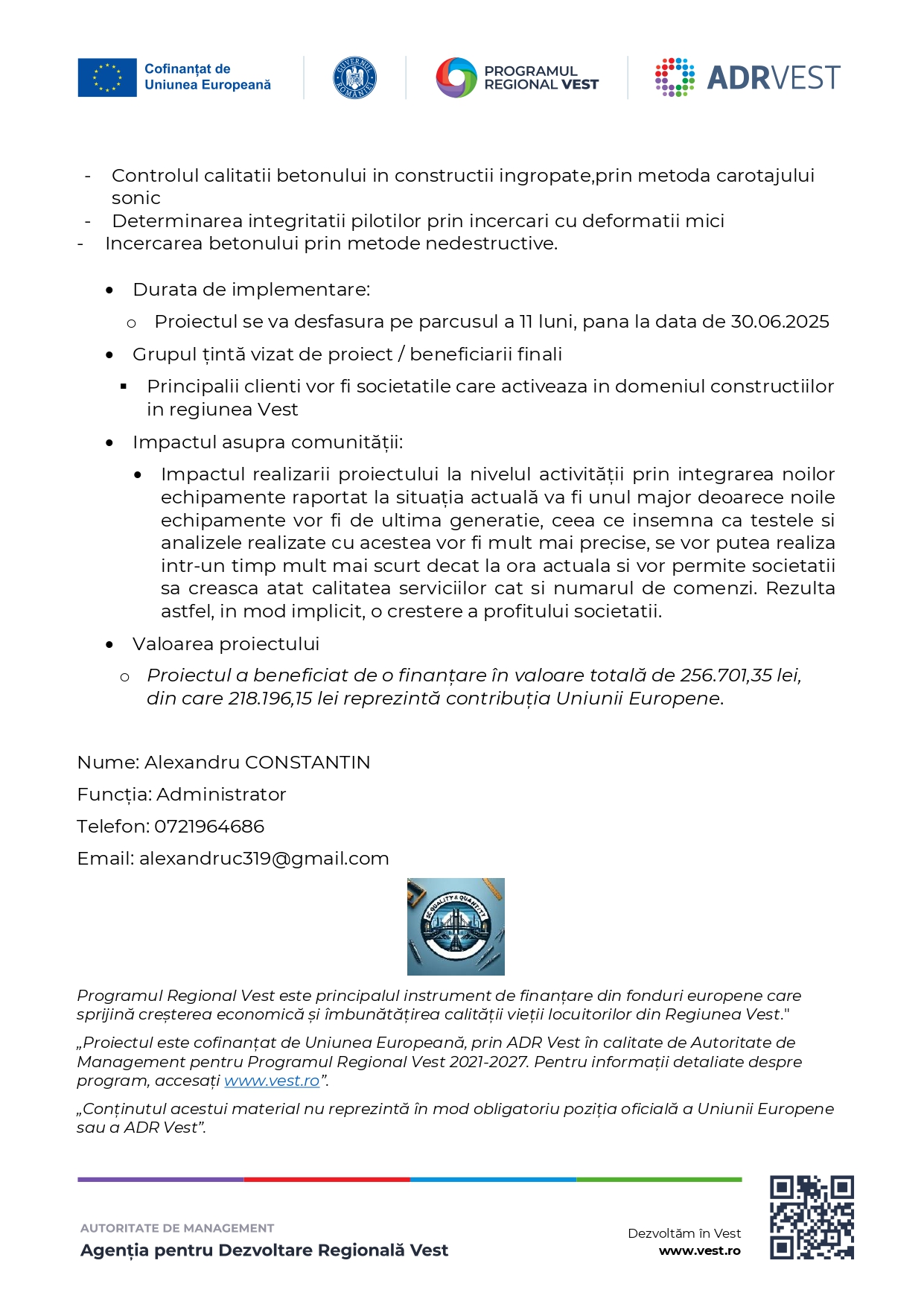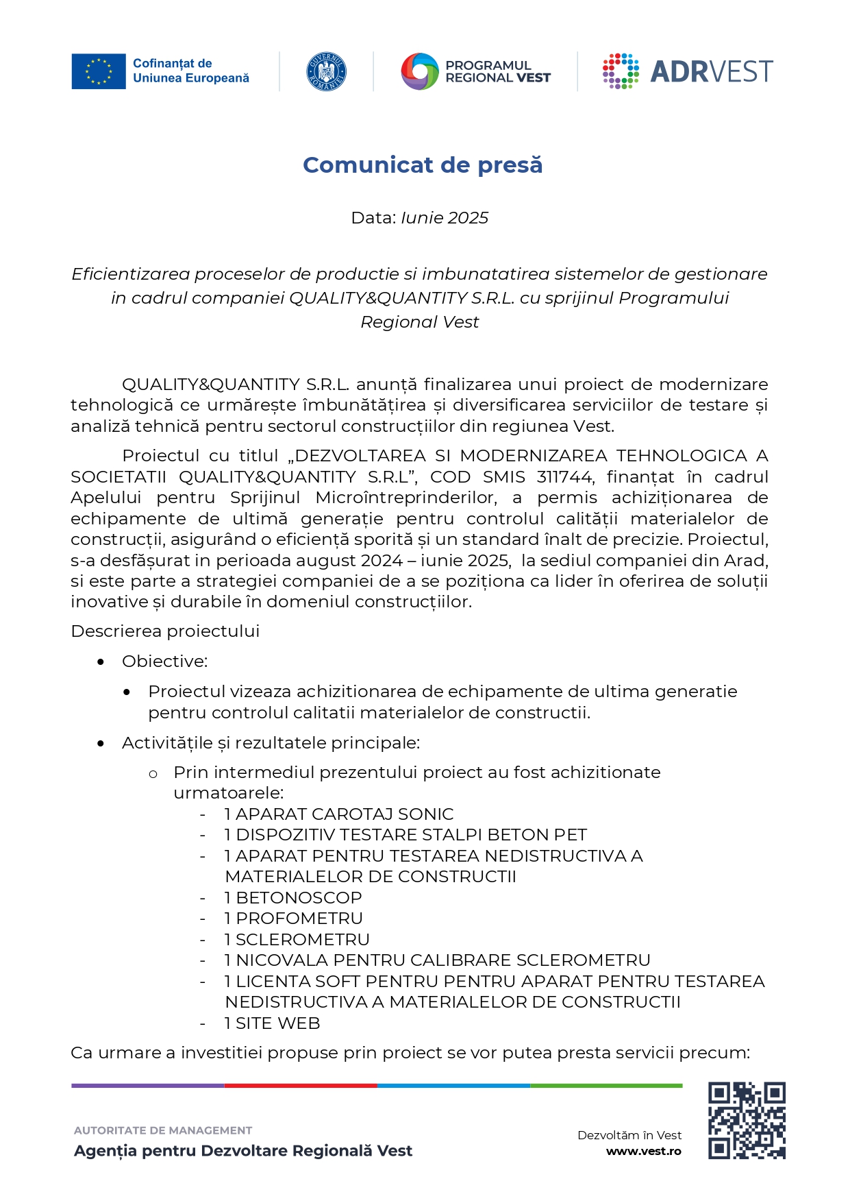 QUALITY&QUANTITY S.R.L. anunță finalizarea unui proiect de modernizare tehnologică ce urmărește îmbunătățirea și diversificarea serviciilor de testare și analiză tehnică pentru sectorul construcțiilor din regiunea Vest.