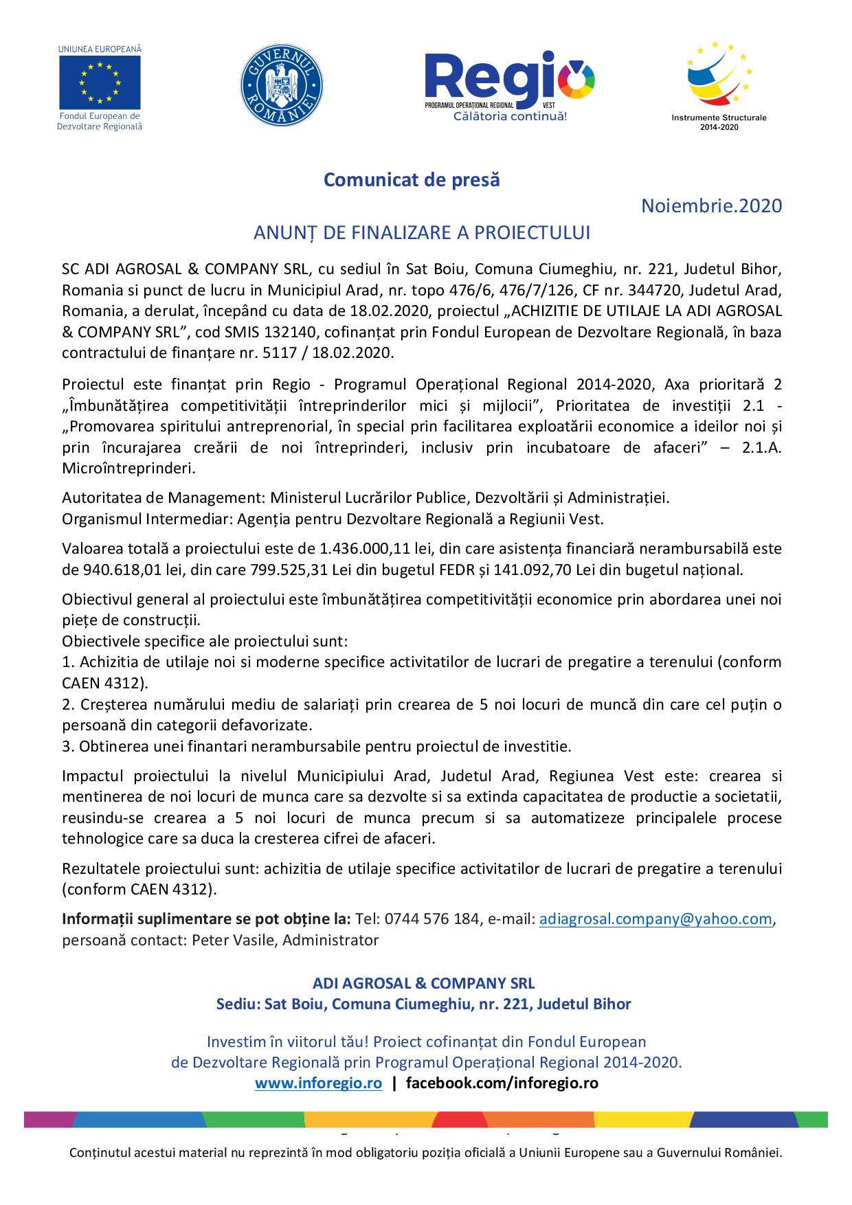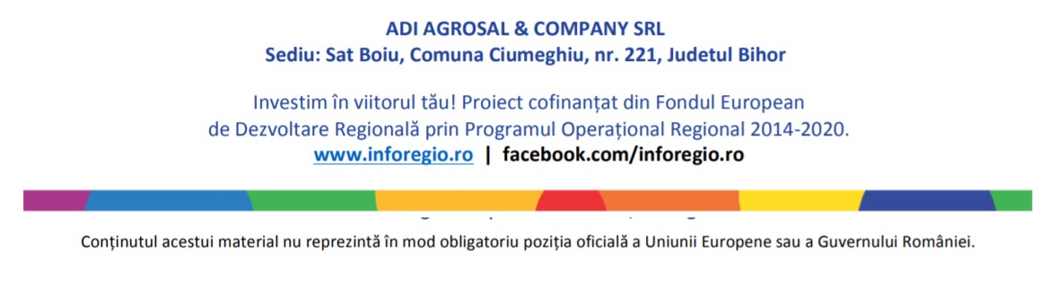 SC ADI AGROSAL & COMPANY SRL, cu sediul în Sat Boiu, Comuna Ciumeghiu, nr. 221, Judetul Bihor, Romania si punct de lucru in Municipiul Arad, nr. topo 476/6, 476/7/126, CF nr. 344720, Judetul Arad, Romania, a derulat, începând cu data de 18.02.2020, proiectul „ACHIZITIE DE UTILAJE LA ADI AGROSAL & COMPANY SRL”, cod SMIS 132140, cofinanțat prin Fondul European de Dezvoltare Regională, în baza contractului de finanțare nr. 5117 / 18.02.2020.