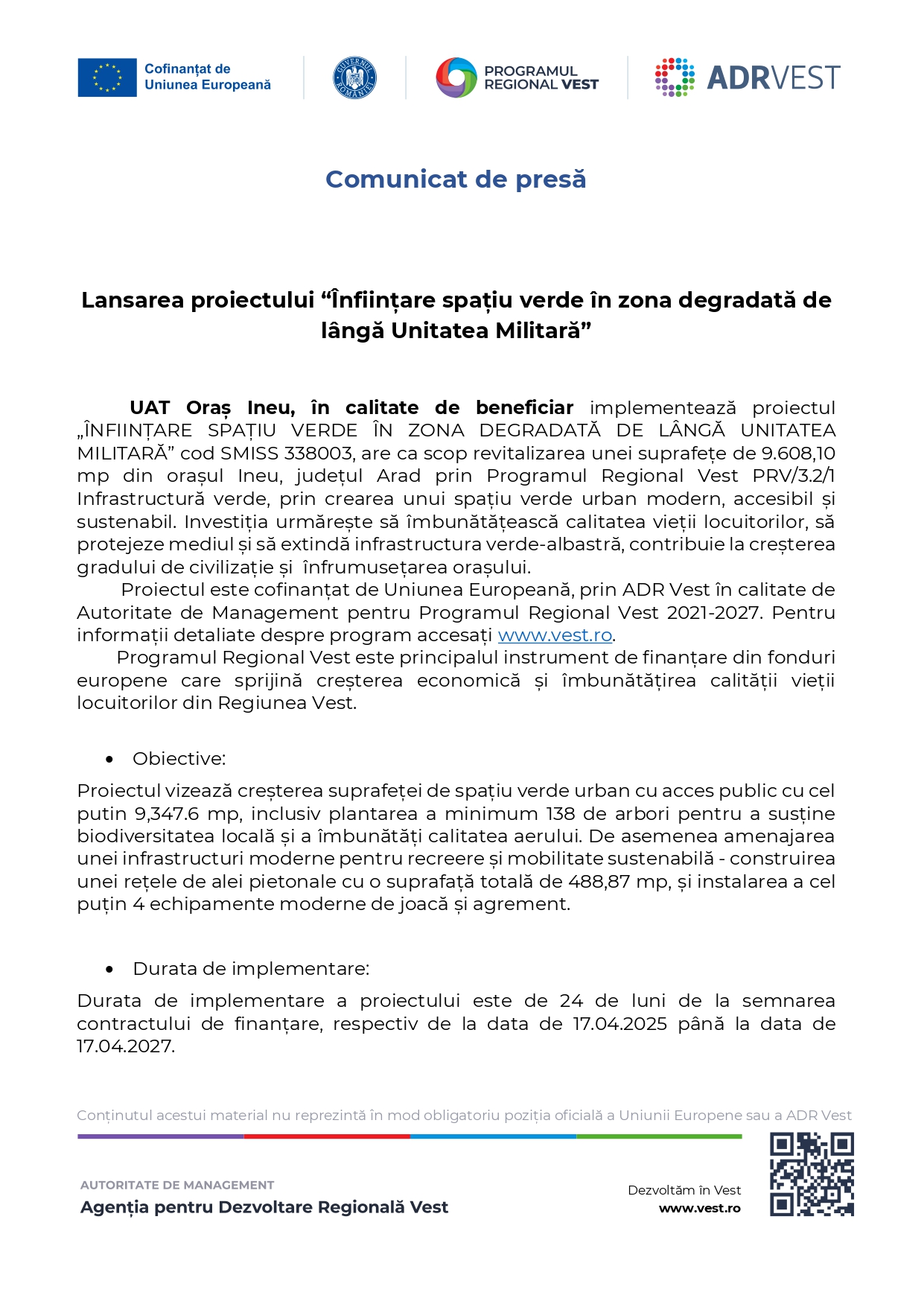 UAT Oraș Ineu, în calitate de beneficiar implementează proiectul „ÎNFIINȚARE SPAȚIU VERDE ÎN ZONA DEGRADATĂ DE LÂNGĂ UNITATEA MILITARĂ” cod SMISS 338003, are ca scop revitalizarea unei suprafețe de 9.608,10 mp din orașul Ineu, județul Arad prin Programul Regional Vest PRV/3.2/1 Infrastructură verde, prin crearea unui spațiu verde urban modern, accesibil și sustenabil. Investiția urmărește să îmbunătățească calitatea vieții locuitorilor, să protejeze mediul și să extindă infrastructura verde-albastră, contribuie la creșterea gradului de civilizație și înfrumusețarea orașului.