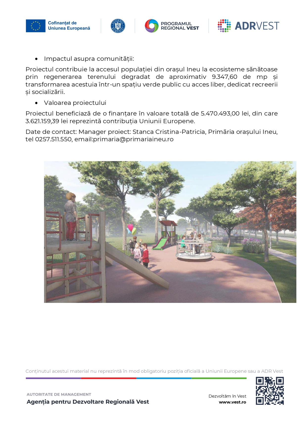 Date de contact: Manager proiect: Stanca Cristina-Patricia, Primăria orașului Ineu, tel 0257.511.550, email:primaria@primariaineu.ro