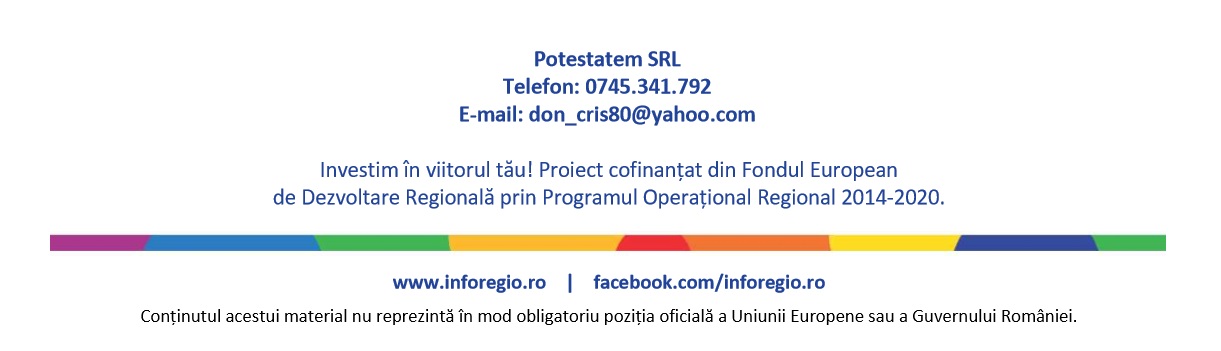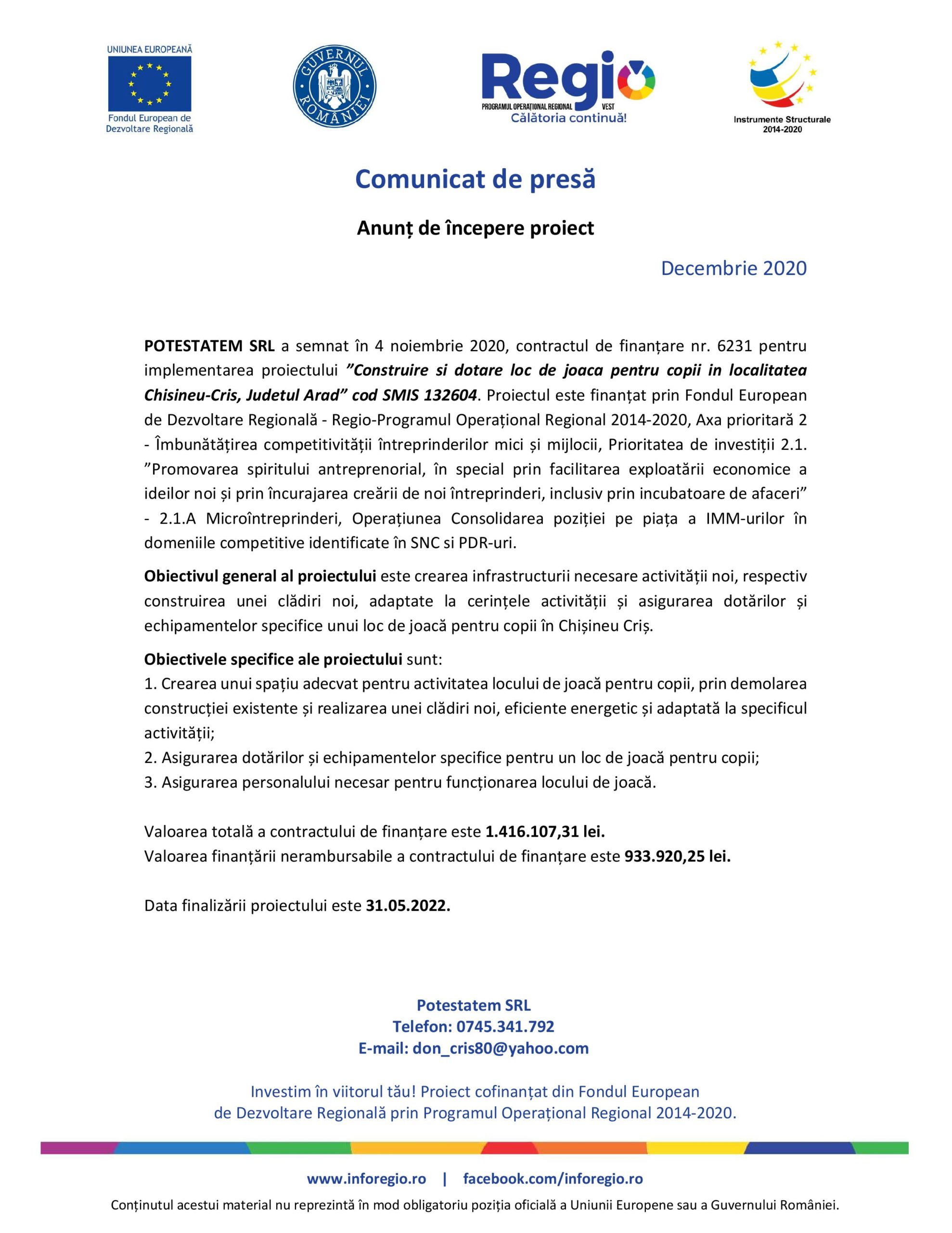 POTESTATEM SRL a semnat în 4 noiembrie 2020, contractul de finanțare nr. 6231 pentru implementarea proiectului ”Construire si dotare loc de joaca pentru copii in localitatea Chisineu-Cris, Judetul Arad” cod SMIS 132604. Proiectul este finanțat prin Fondul European de Dezvoltare Regională – Regio-Programul Operațional Regional 2014-2020, Axa prioritară 2 – Îmbunătățirea competitivității întreprinderilor mici și mijlocii, Prioritatea de investiții 2.1. ”Promovarea spiritului antreprenorial, în special prin facilitarea exploatării economice a ideilor noi și prin încurajarea creării de noi întreprinderi, inclusiv prin incubatoare de afaceri” – 2.1.A Microîntreprinderi, Operațiunea Consolidarea poziției pe piața a IMM-urilor în domeniile competitive identificate în SNC si PDR-uri.