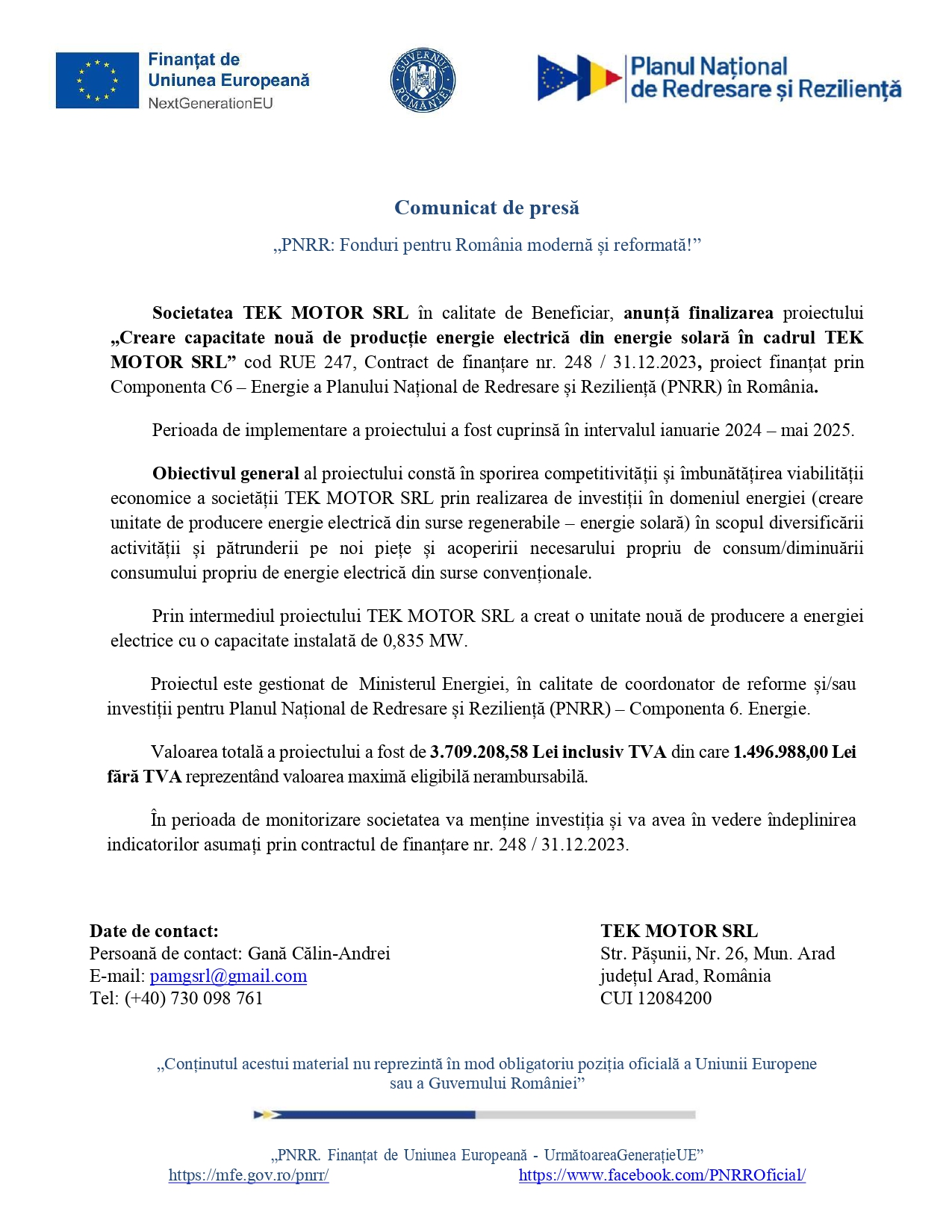 Societatea TEK MOTOR SRL în calitate de Beneficiar, anunță finalizarea proiectului „Creare capacitate nouă de producție energie electrică din energie solară în cadrul TEK MOTOR SRL” cod RUE 247, Contract de finanțare nr. 248 / 31.12.2023, proiect finanțat prin Componenta C6 – Energie a Planului Național de Redresare și Reziliență (PNRR) în România.
