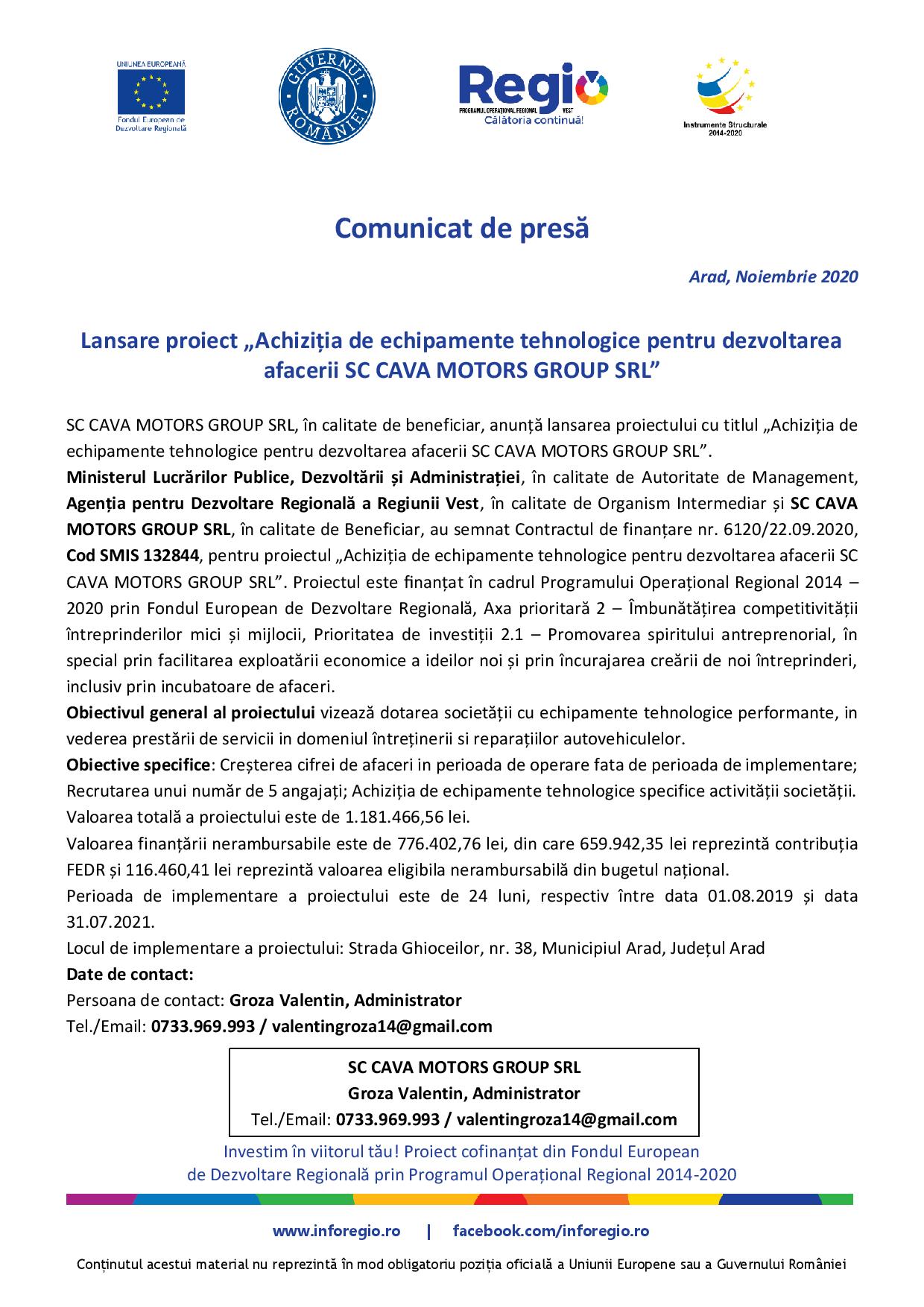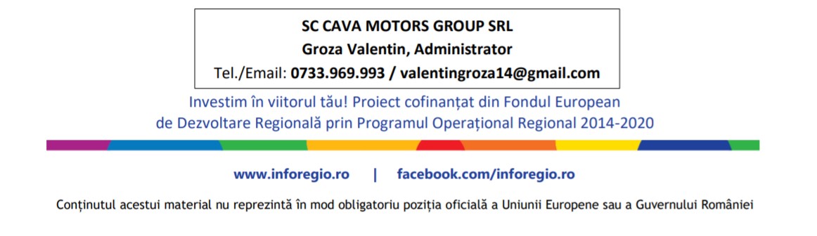 Ministerul Lucrărilor Publice, Dezvoltării și Administrației, în calitate de Autoritate de Management, Agenția pentru Dezvoltare Regională a Regiunii Vest, în calitate de Organism Intermediar și SC CAVA MOTORS GROUP SRL, în calitate de Beneficiar, au semnat Contractul de finanțare nr. 6120/22.09.2020, Cod SMIS 132844, pentru proiectul „Achiziția de echipamente tehnologice pentru dezvoltarea afacerii SC CAVA MOTORS GROUP SRL”. Proiectul este finanțat în cadrul Programului Operațional Regional 2014 – 2020 prin Fondul European de Dezvoltare Regională, Axa prioritară 2 – Îmbunătățirea competitivității întreprinderilor mici și mijlocii, Prioritatea de investiții 2.1 – Promovarea spiritului antreprenorial, în special prin facilitarea exploatării economice a ideilor noi și prin încurajarea creării de noi întreprinderi, inclusiv prin incubatoare de afaceri.