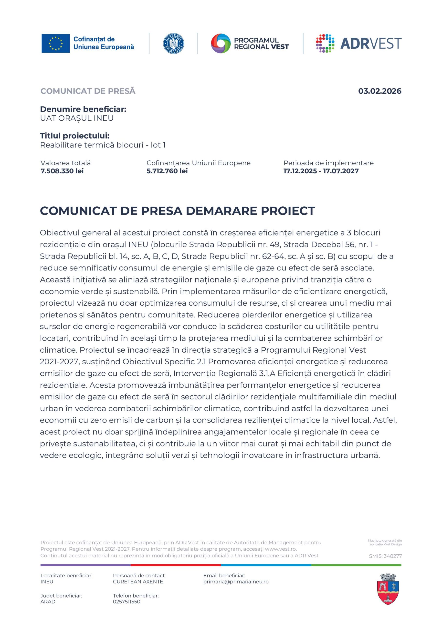 Această inițiativă se aliniază strategiilor naționale și europene privind tranziția către o economie verde și sustenabilă. Prin implementarea măsurilor de eficientizare energetică, proiectul vizează nu doar optimizarea consumului de resurse, ci și crearea unui mediu mai prietenos și sănătos pentru comunitate. Reducerea pierderilor energetice și utilizarea surselor de energie regenerabilă vor conduce la scăderea costurilor cu utilitățile pentru locatari, contribuind în același timp la protejarea mediului și la combaterea schimbărilor climatice. Proiectul se încadrează în direcția strategică a Programului Regional Vest 2021-2027, susținând Obiectivul Specific 2.1 Promovarea eficienței energetice și reducerea emisiilor de gaze cu efect de seră, Intervenția Regională 3.1.A Eficiență energetică în clădiri rezidențiale. Acesta promovează îmbunătățirea performanțelor energetice și reducerea emisiilor de gaze cu efect de seră în sectorul clădirilor rezidențiale multifamiliale din mediul urban în vederea combaterii schimbărilor climatice, contribuind astfel la dezvoltarea unei economii cu zero emisii de carbon și la consolidarea rezilienței climatice la nivel local. Astfel, acest proiect nu doar sprijină îndeplinirea angajamentelor locale și regionale în ceea ce privește sustenabilitatea, ci și contribuie la un viitor mai curat și mai echitabil din punct de vedere ecologic, integrând soluții verzi și tehnologii inovatoare în infrastructura urbană.
