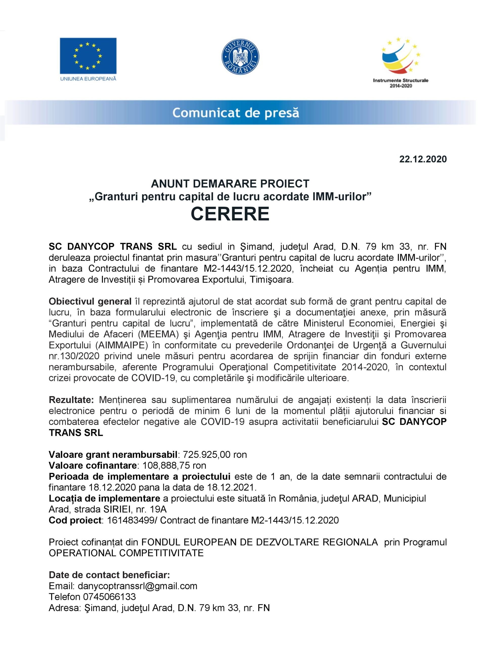 SC DANYCOP TRANS SRL cu sediul in Şimand, judeţul Arad, D.N. 79 km 33, nr. FN deruleaza proiectul finantat prin masura’’Granturi pentru capital de lucru acordate IMM-urilor’’, in baza Contractului de finantare M2-1443/15.12.2020, încheiat cu Agenția pentru IMM, Atragere de Investiții și Promovarea Exportului, Timişoara.